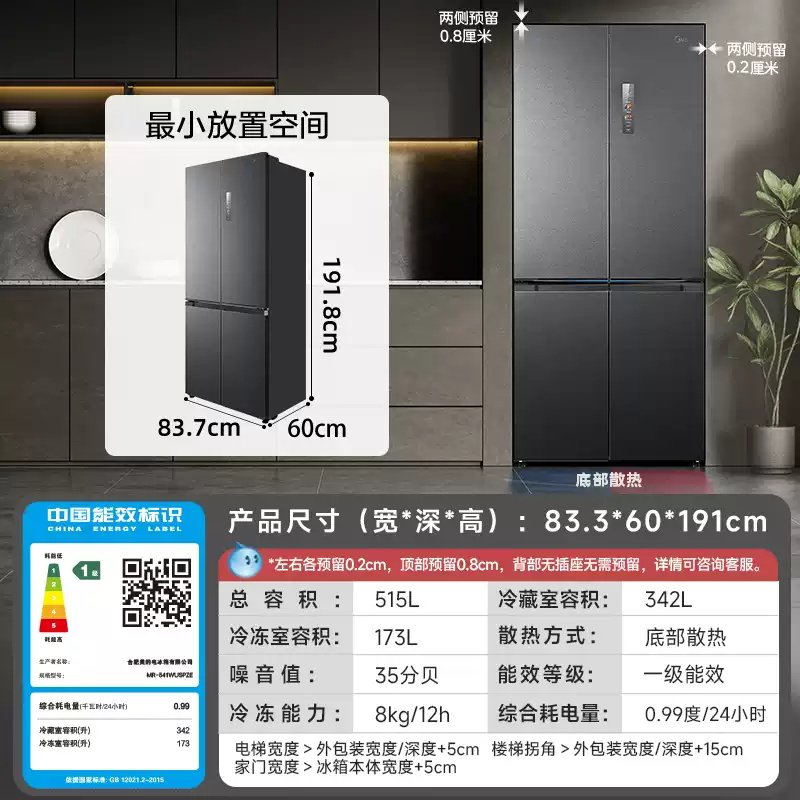 美的570+/606对开双开门两门大容量家用冰箱一级节能风冷无霜超薄