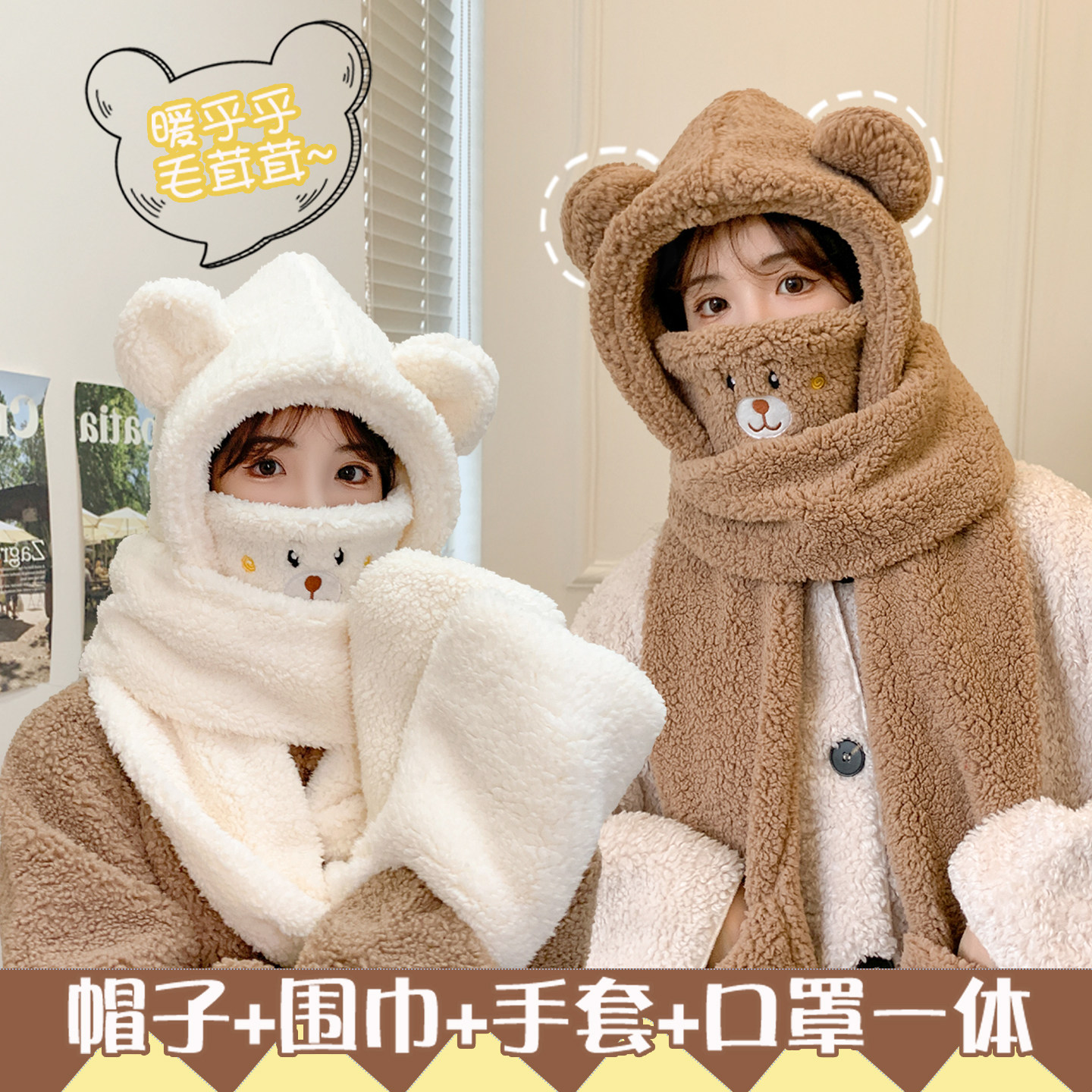帽子围巾一体2025新款小熊女冬季加厚手套围脖毛茸茸防寒骑车防风