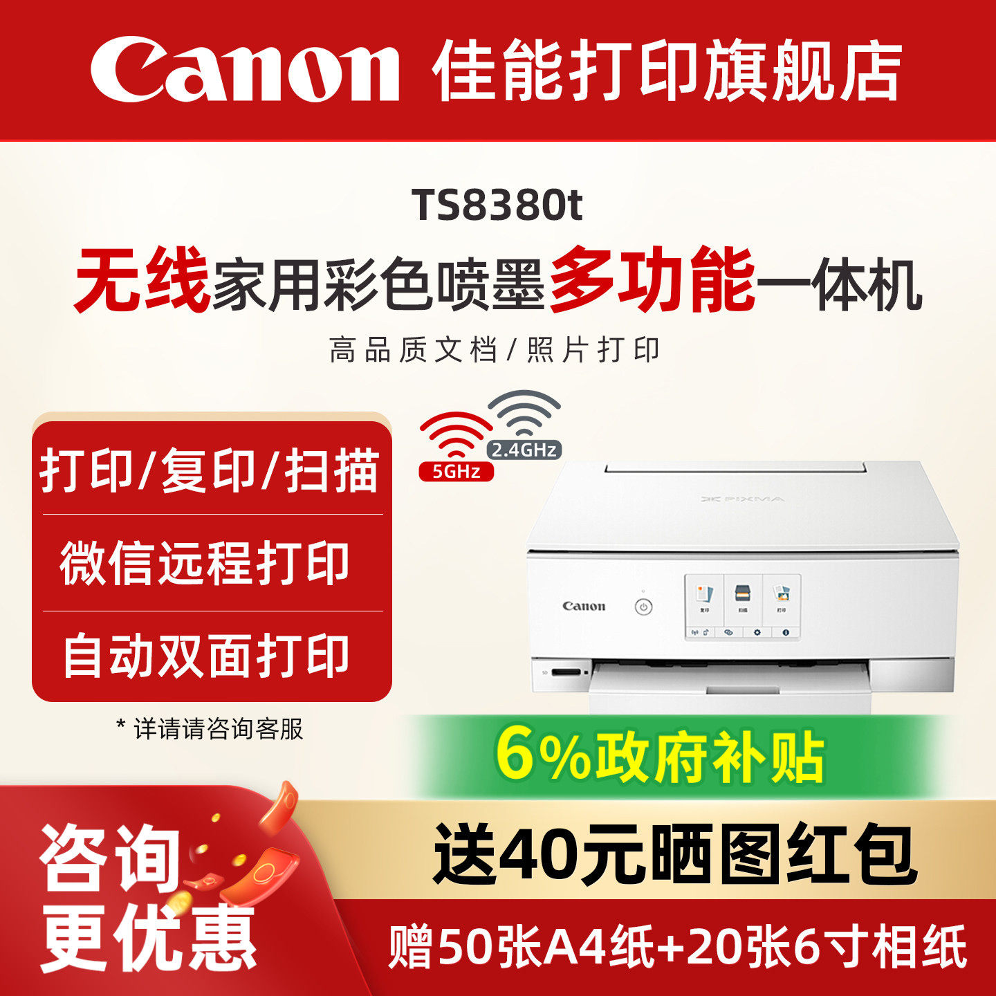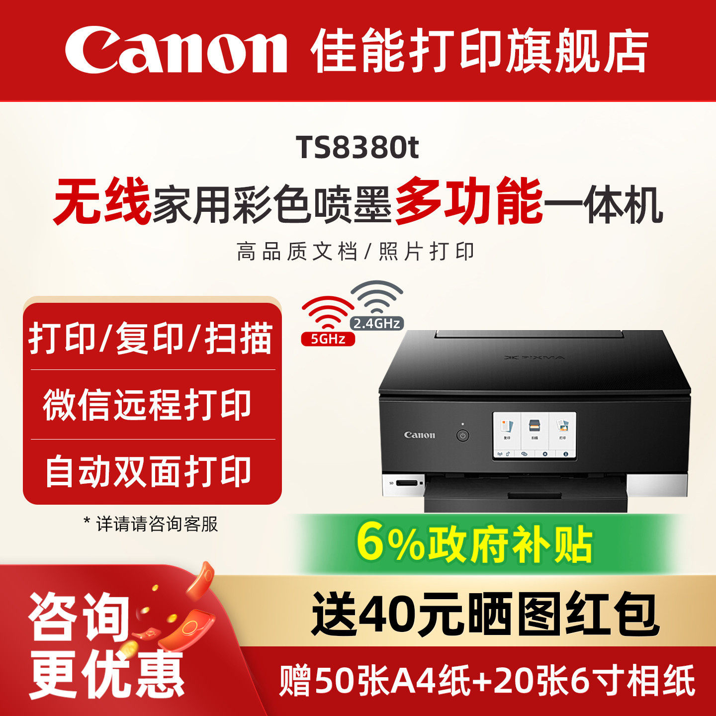 佳能旗舰店TS8380t彩色A4喷墨6色打印复印扫描一体机学生家用小型微信远程打印自动双面高清照相片办公