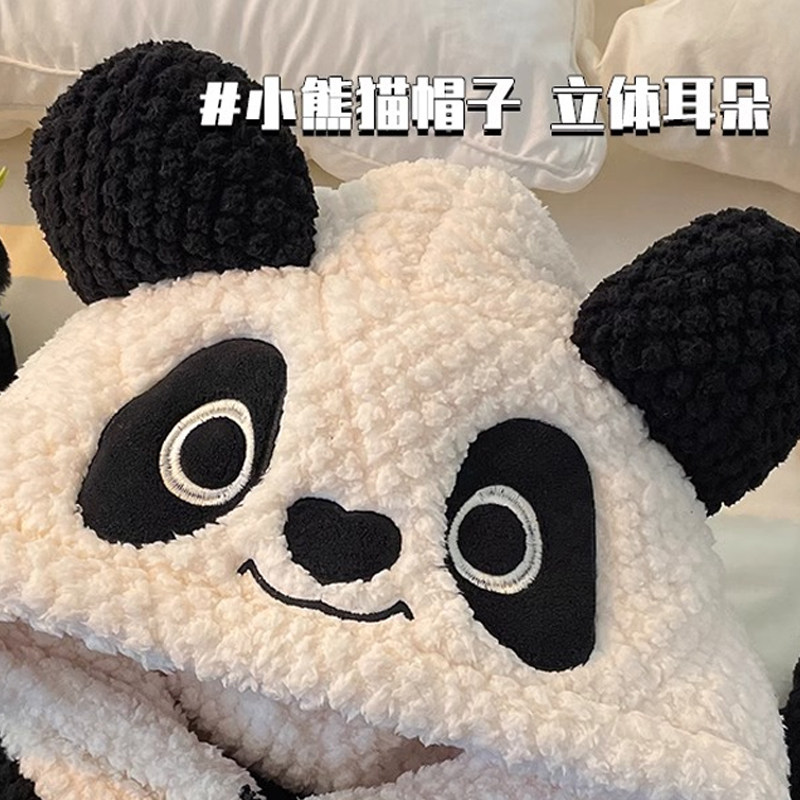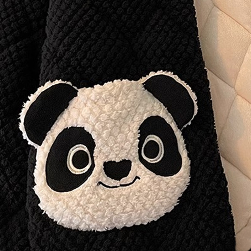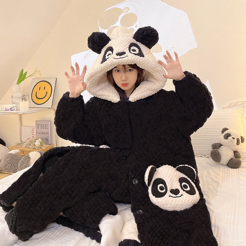 珊瑚绒睡衣女冬季加绒加厚三层夹棉熊猫连帽长款家居服套装