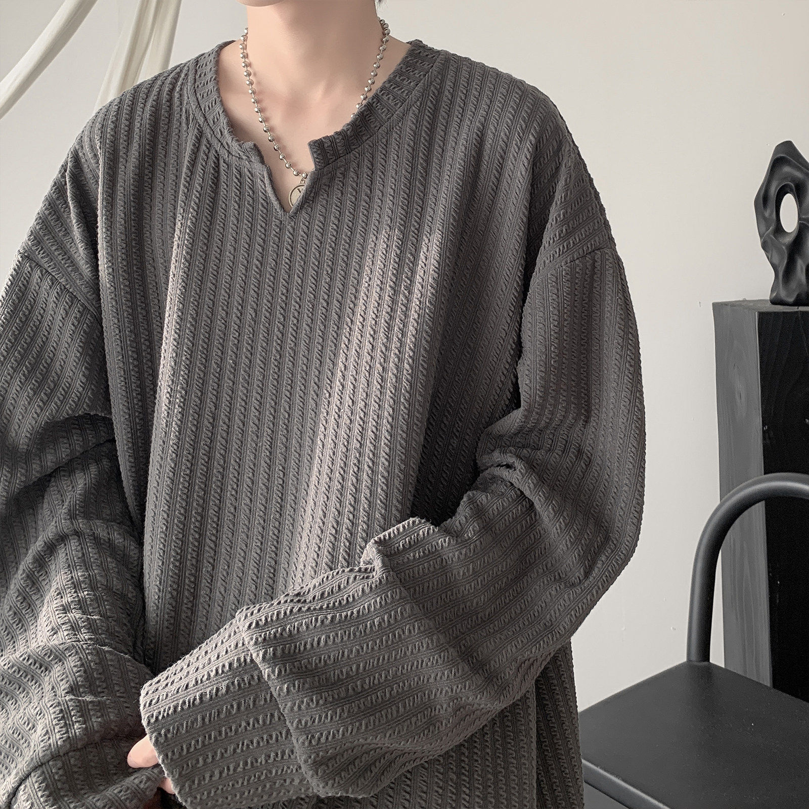 肌理V领长袖T恤男春季潮牌宽松重磅上衣痞帅高级感白色内搭打底衫