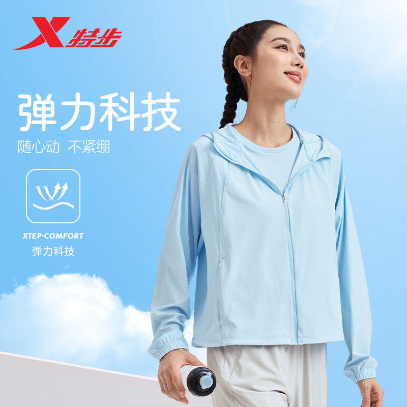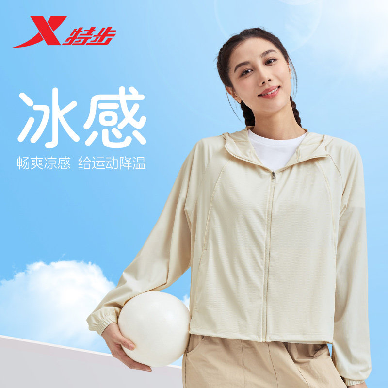 特步冰丝训练外套女2026春夏弹力防晒衣运动连帽风衣防紫外线上衣