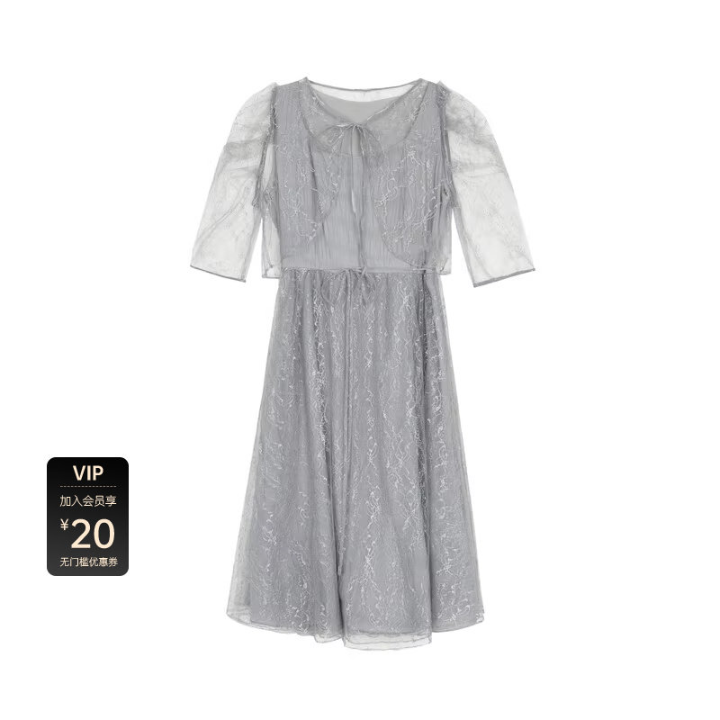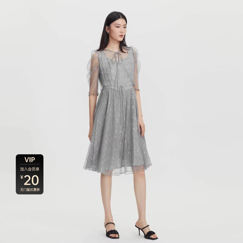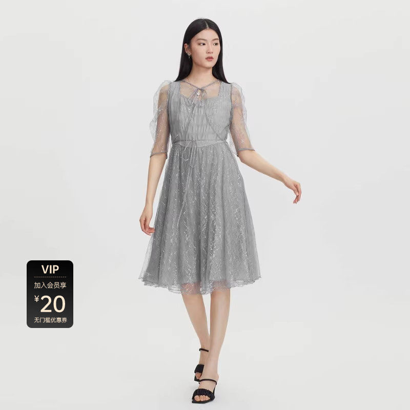 sdeer圣迪奥女装网纱收腰泡泡袖披肩两件套连衣裙S232Z1263