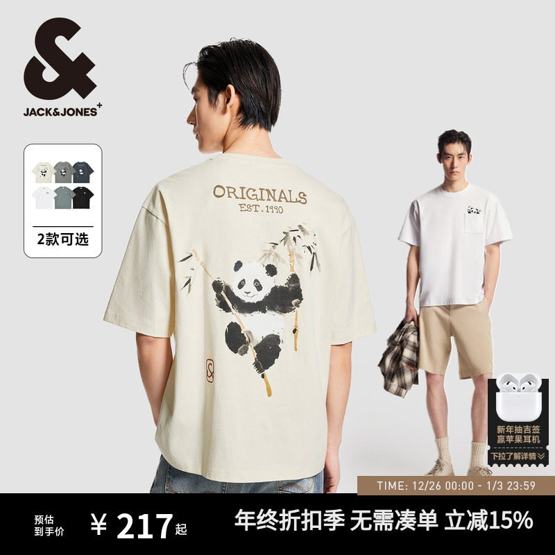 杰克琼斯男装秋季新款水墨熊猫/口袋熊猫情侣款宽松男士短袖T恤衫