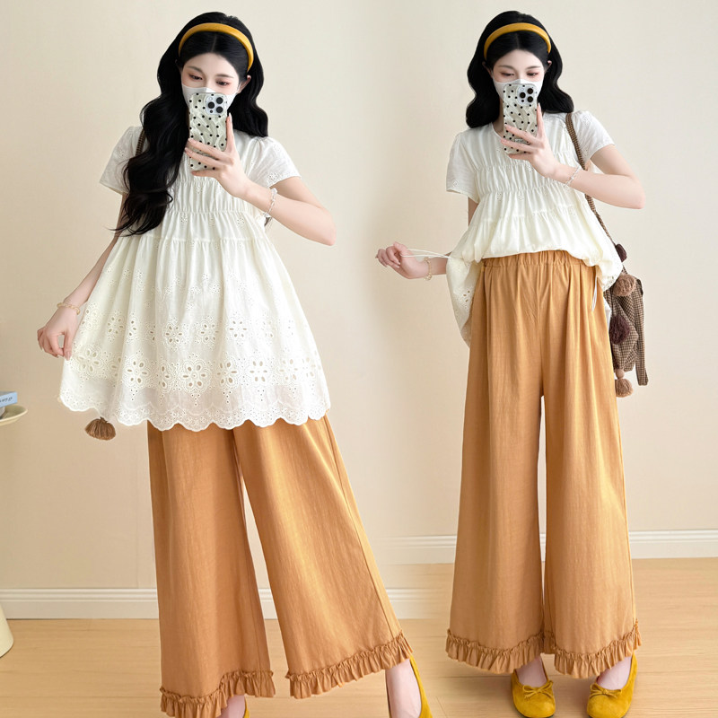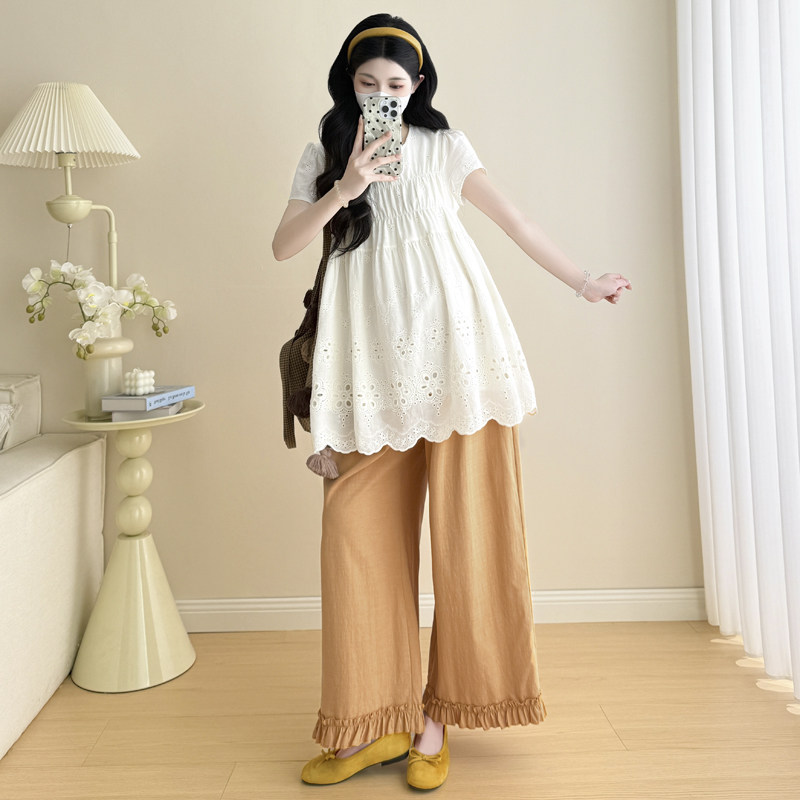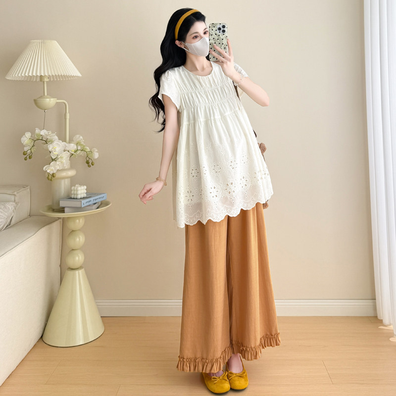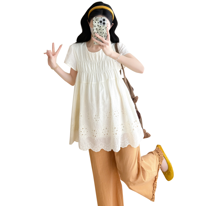婧麒孕妇衬衫春秋装新款短袖宽松显瘦洋气遮孕肚上衣套装潮妈外出