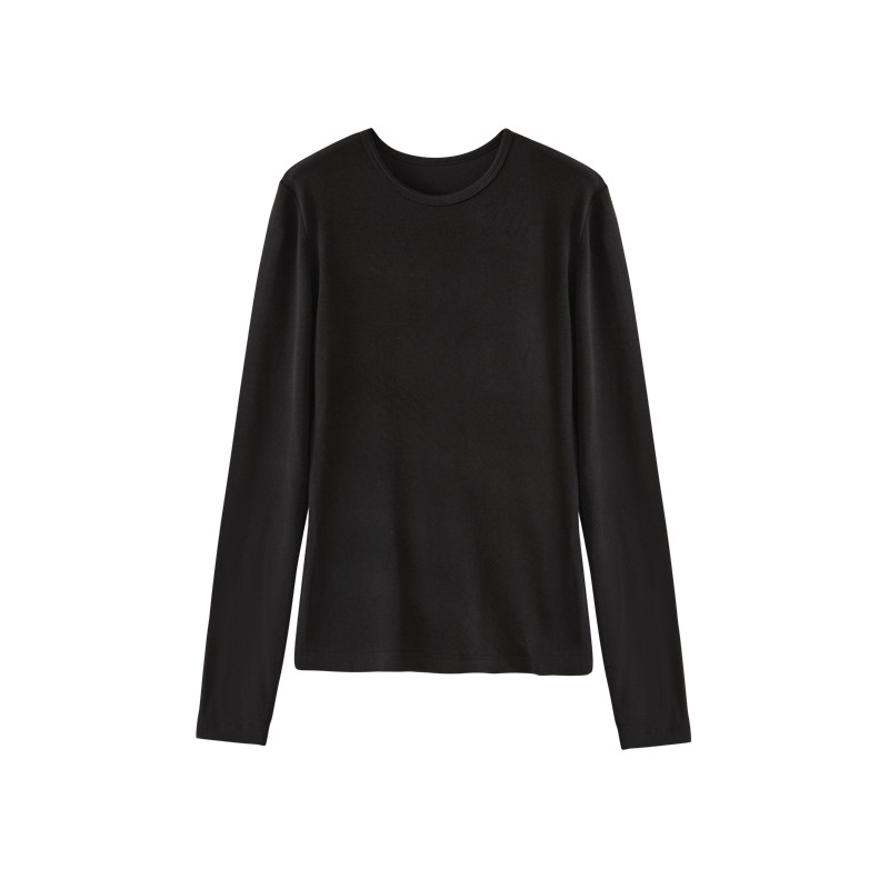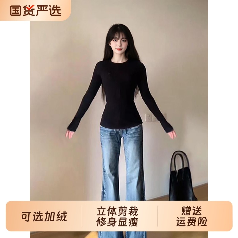 黑色圆领正肩长袖t恤女秋冬新款内搭加绒保暖打底衫修身显瘦上衣