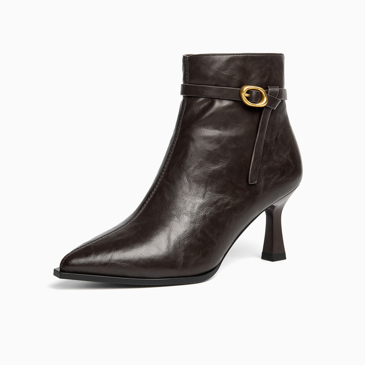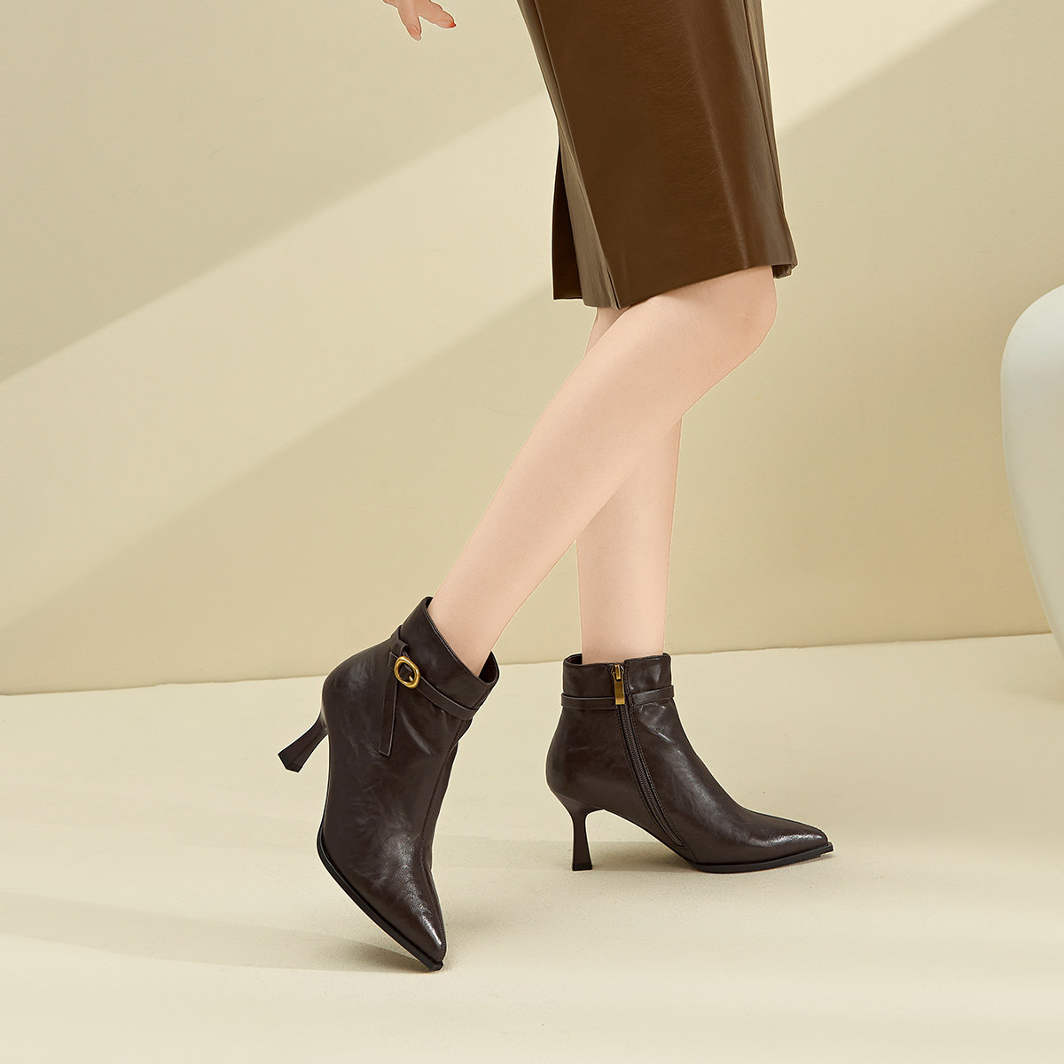 戈美其巨好看秋冬季靴子2025单靴洋气棕色百搭尖头高跟鞋小短靴女