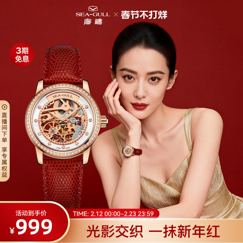 海鸥表红色手表女款轻奢镂空机械表女士腕表403LK新年礼物送女友