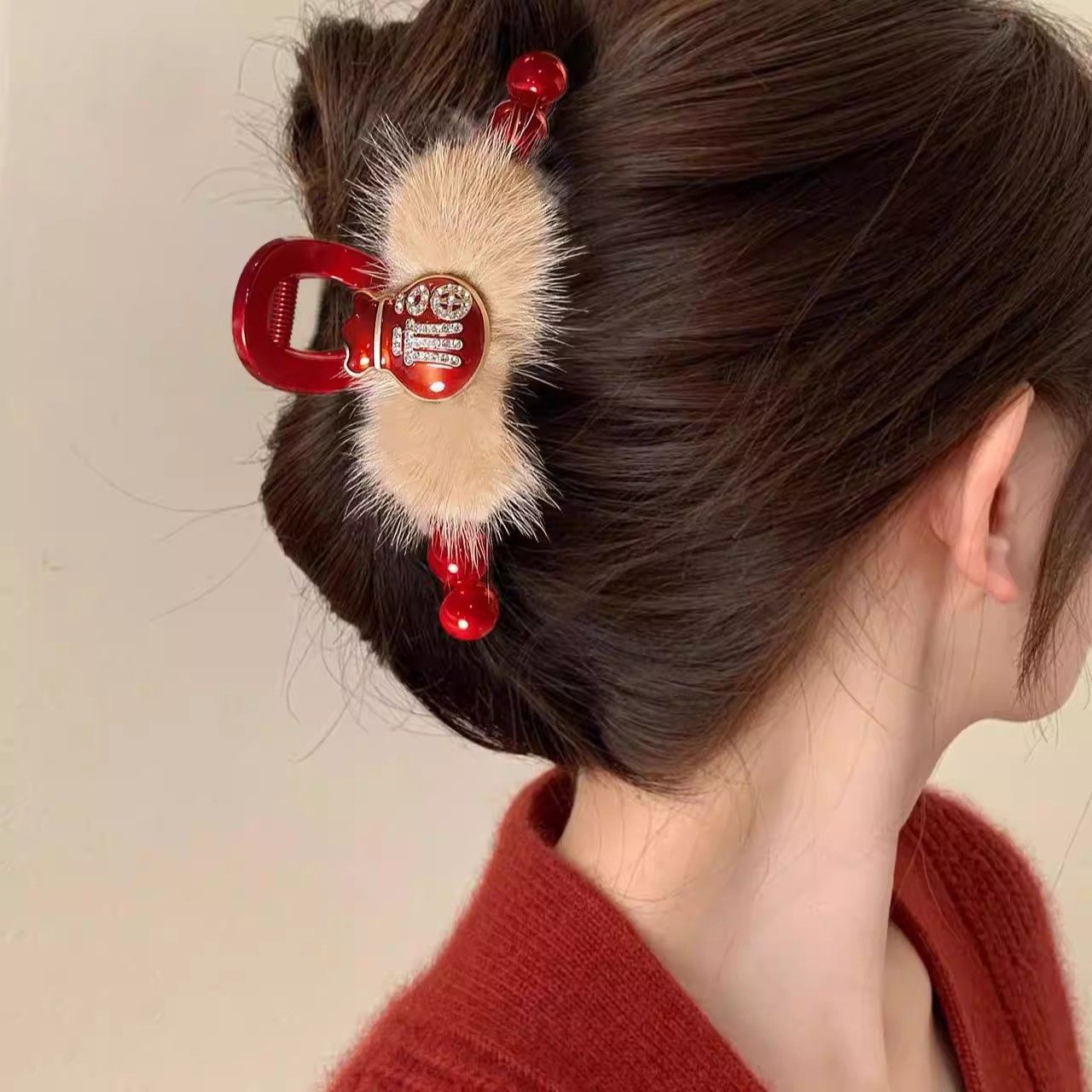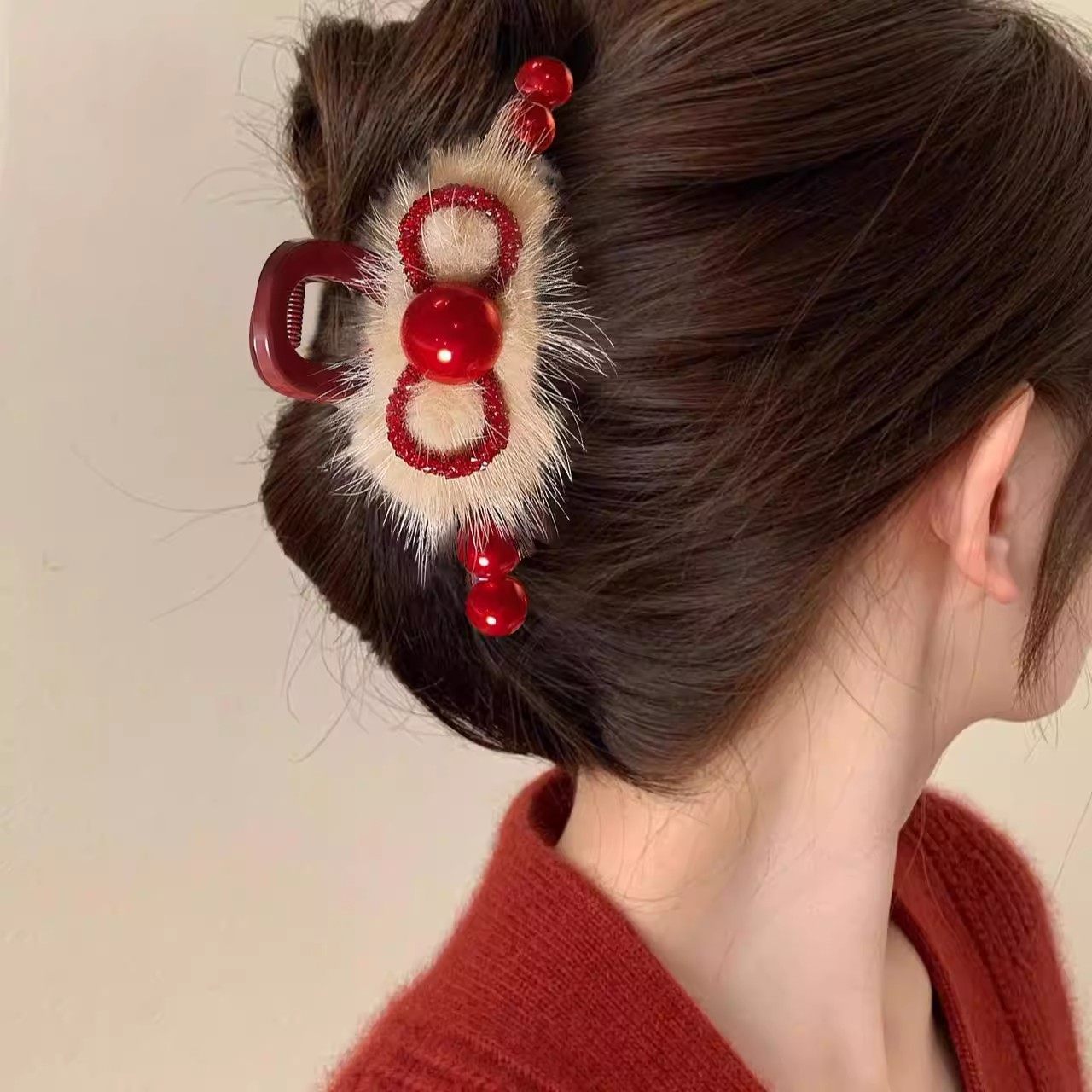 新年红色毛绒珍珠抓夹女2025年新款发夹后脑勺盘发鲨鱼夹发卡发饰