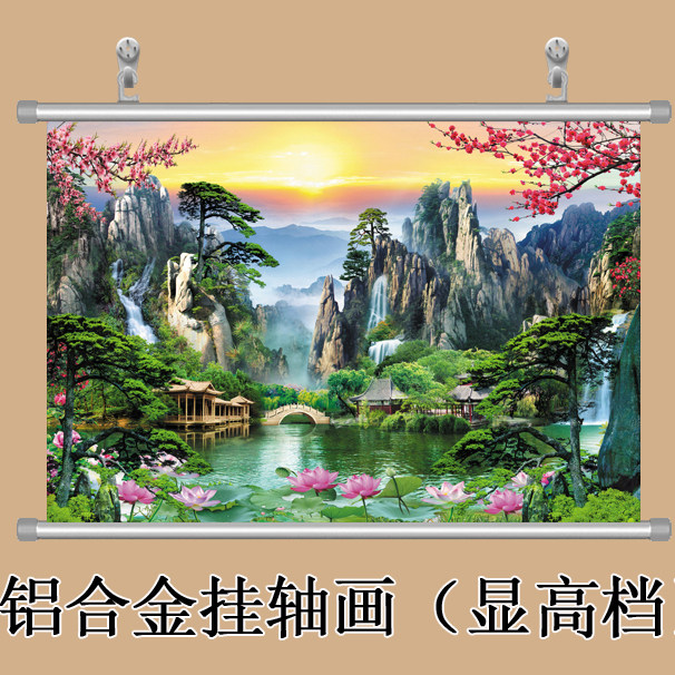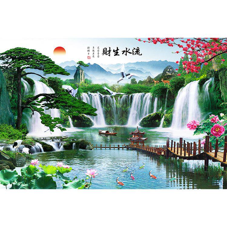 山水画迎客松荷花九鱼图装饰画墙贴画壁画湖水凉亭流水生财风景画