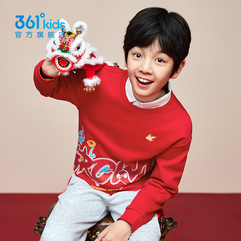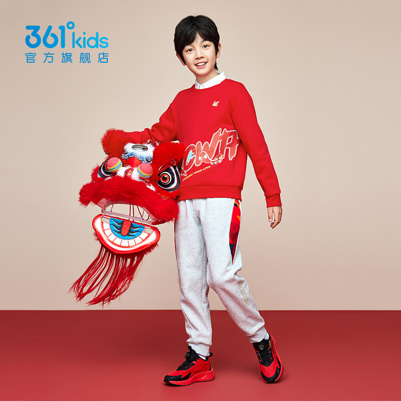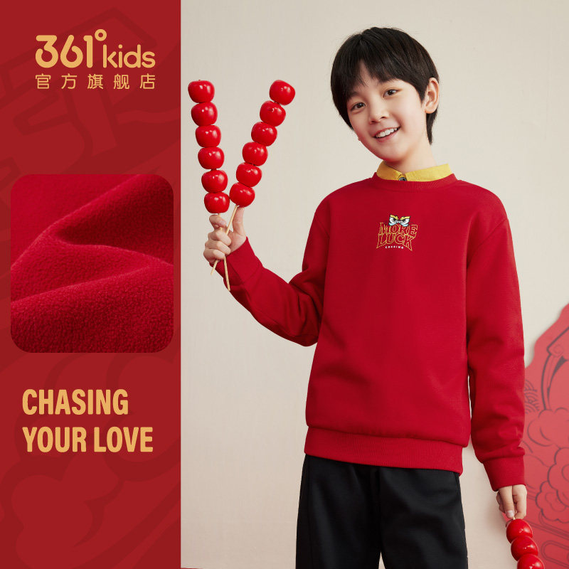361°童装男童加绒保暖套头卫衣2026春季年装红色暖热绒马年上衣
