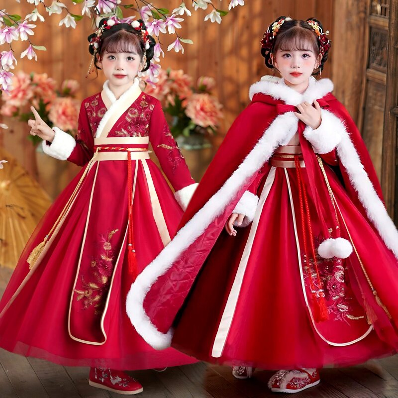 汉服女童冬款加绒古风加厚过年唐装中国风拜年服套装襦裙裙子红色