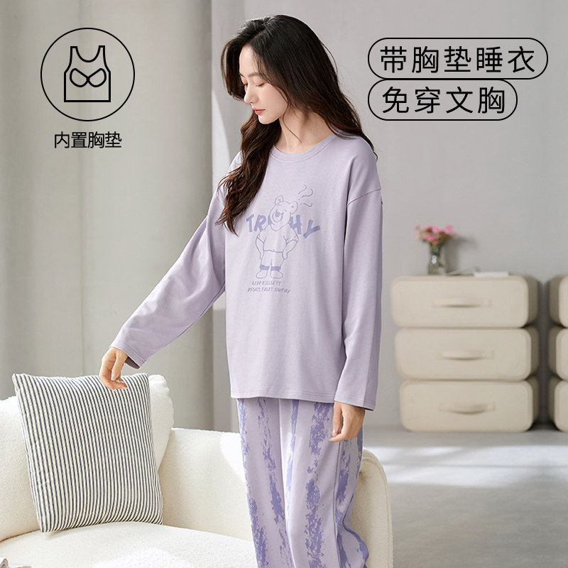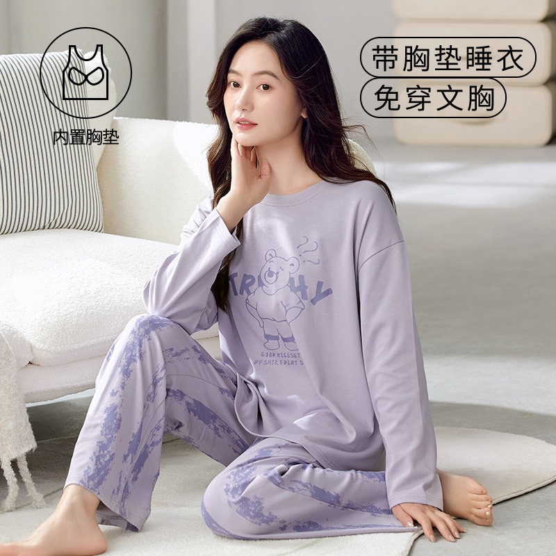 睡衣女士带胸垫春秋季长袖长裤家居服2025新款圆领休闲可外穿套装