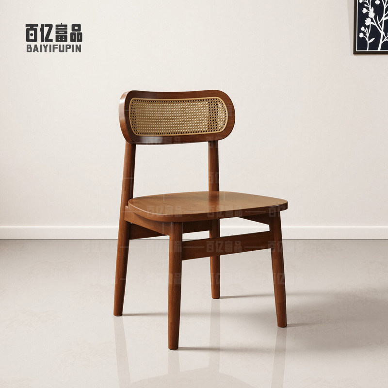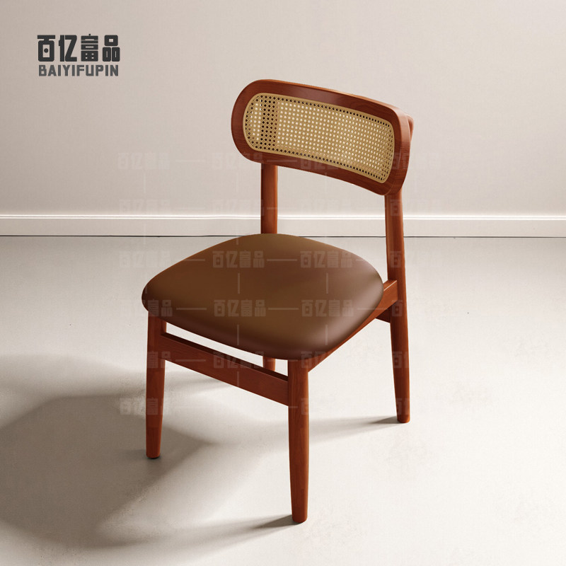 全实木家用餐桌椅法式复古靠背椅高级感中古休闲藤编椅子餐厅软包