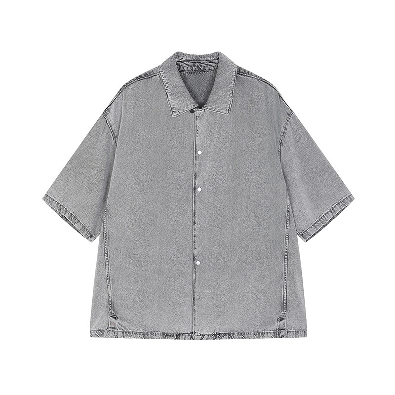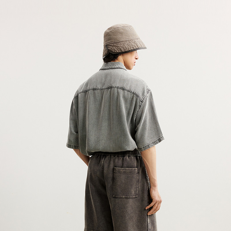 速写男装春秋新款男士衬衫莱赛尔牛仔短袖衬衫翻领水洗复古上衣