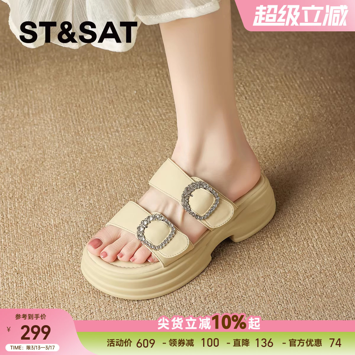【特价秒杀】星期六平底凉鞋夏季铆钉闪钻一字带时装凉鞋女款