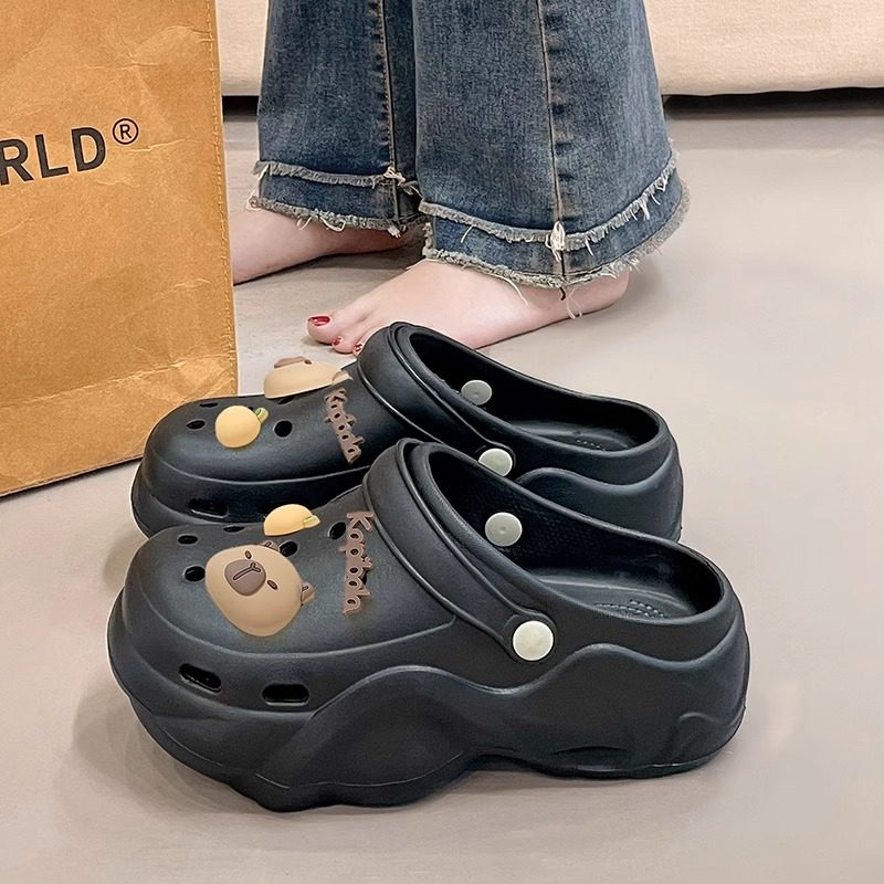 厚底洞洞鞋女款夏季外穿2025新款沙滩松糕婚纱增高跟凉鞋黑色拖鞋