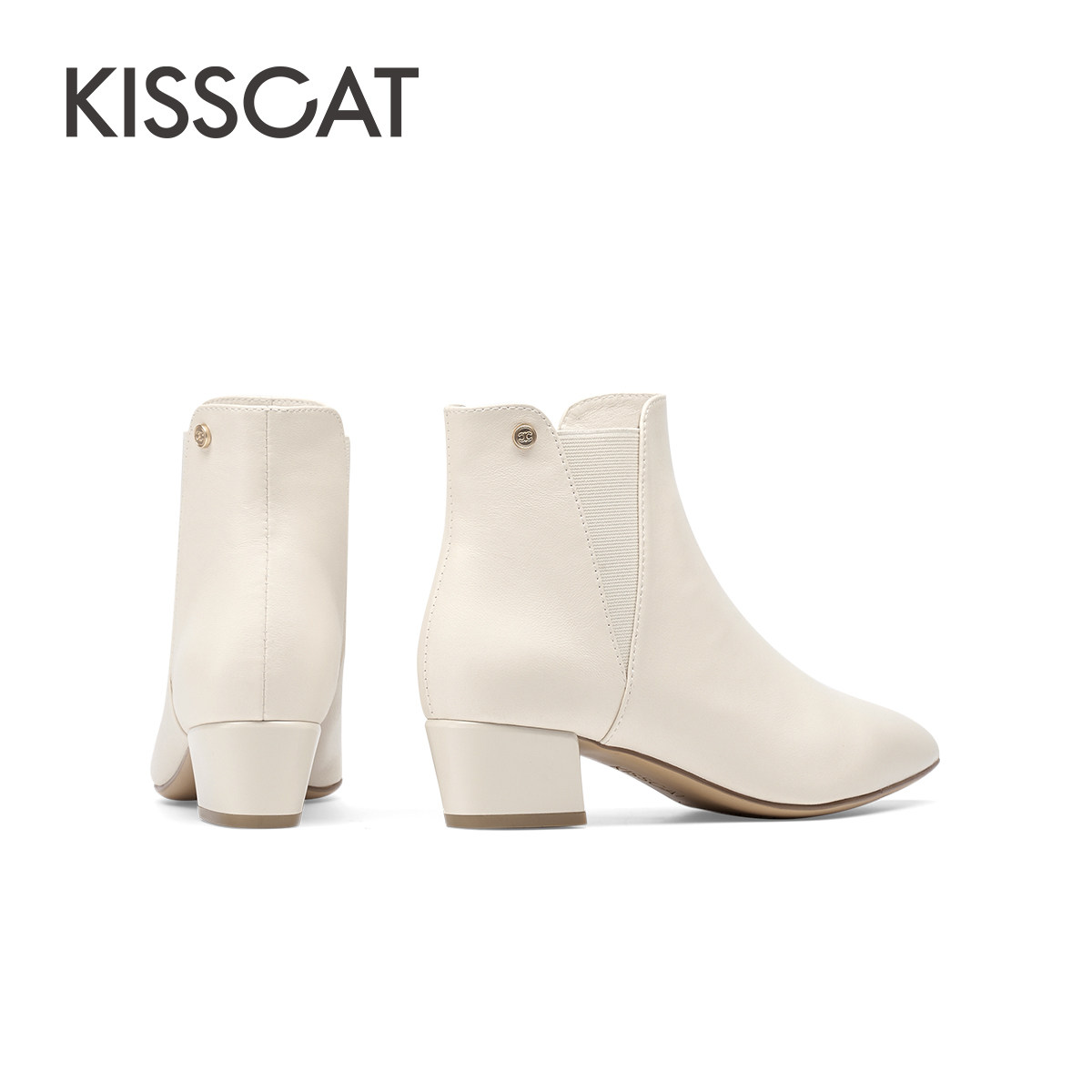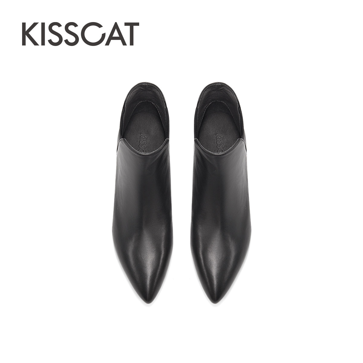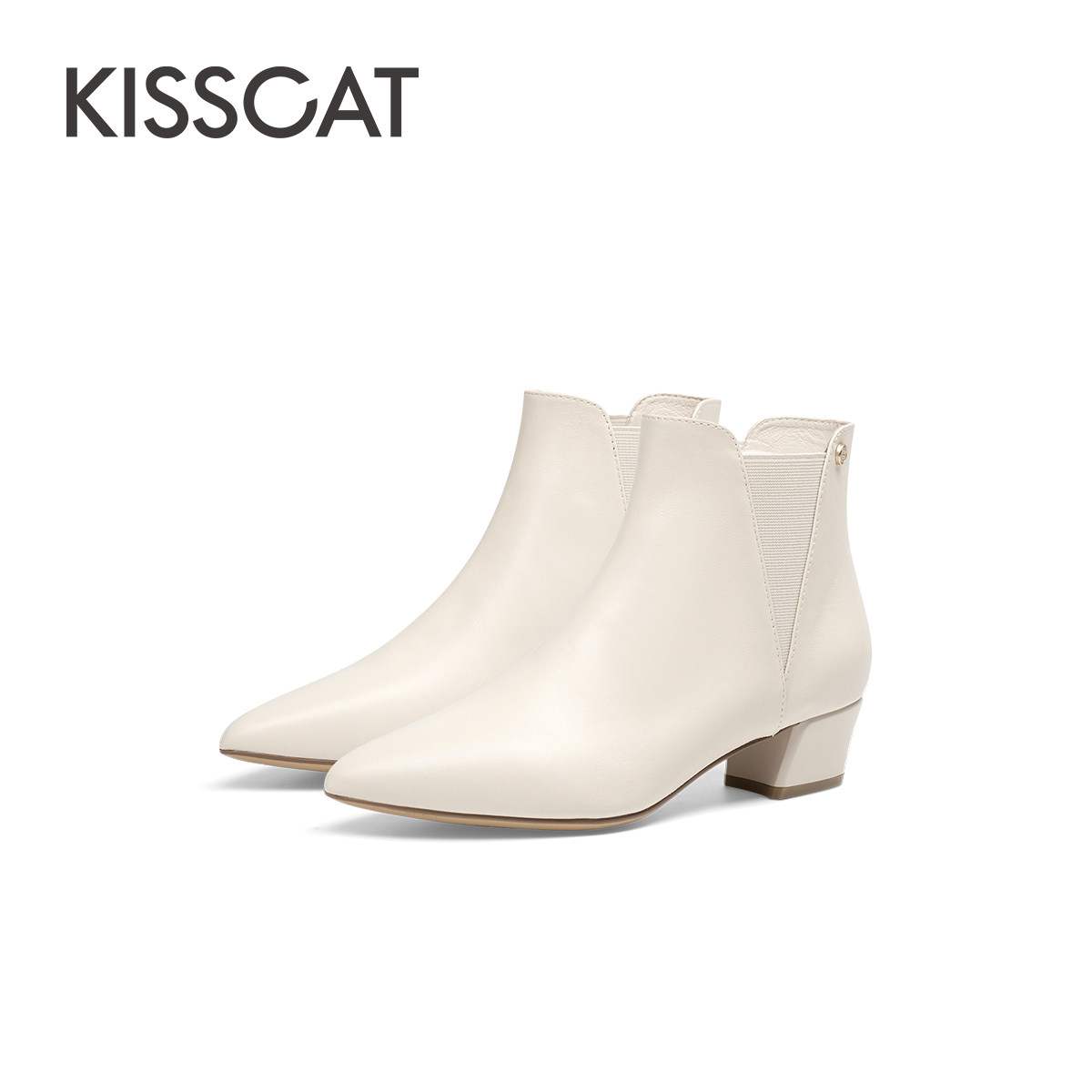 KISSCAT接吻猫冬季尖头优雅弹力短靴女士切尔西踝靴真皮时装靴女