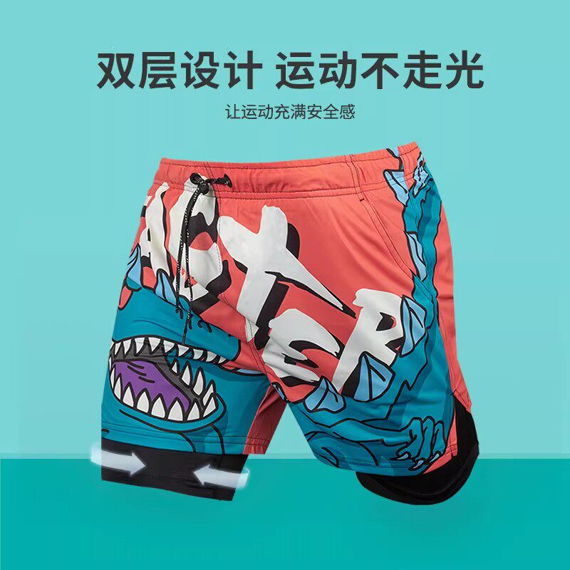 新款男士泳裤双层防尴尬平角裤加大码时尚印花沙滩裤速干游泳裤