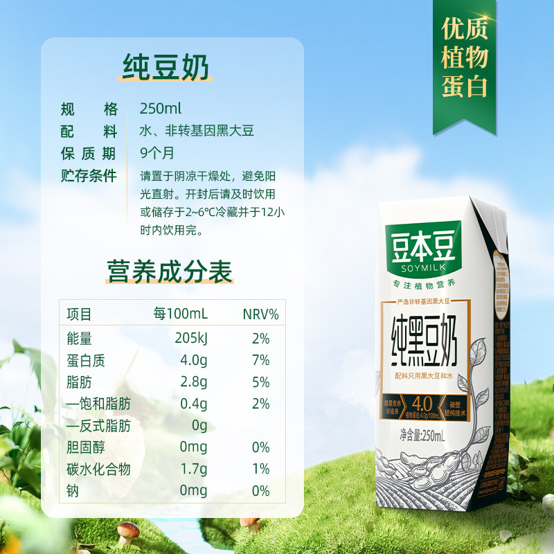 豆本豆纯黑豆奶250ml*12盒整箱装植物蛋白奶蔗糖营养早餐奶原味