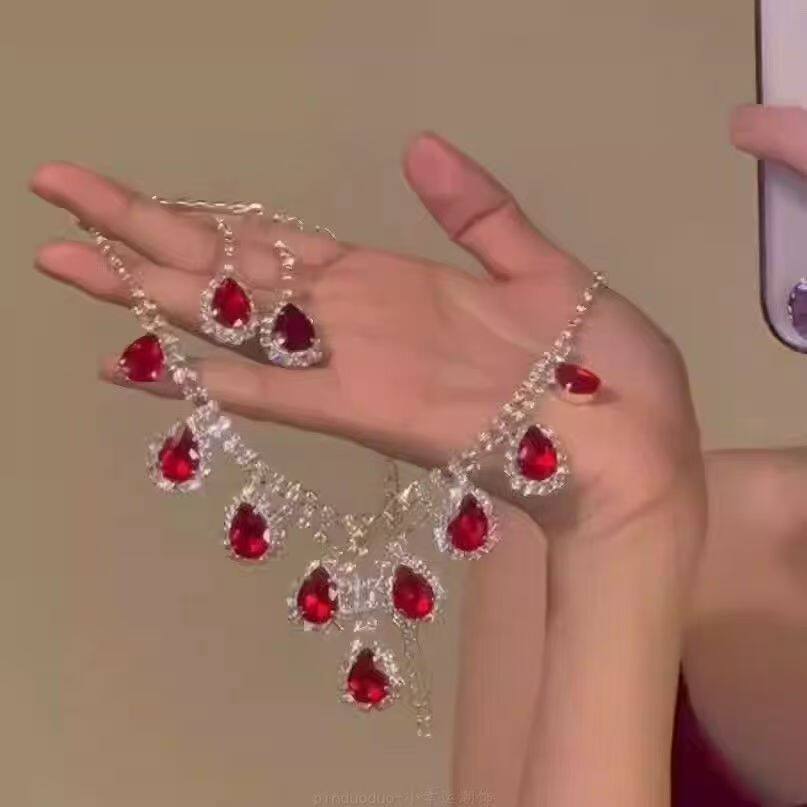 刘亦菲满天星同款红色闪钻项链女锁骨链套装生日礼服新娘晚会配饰