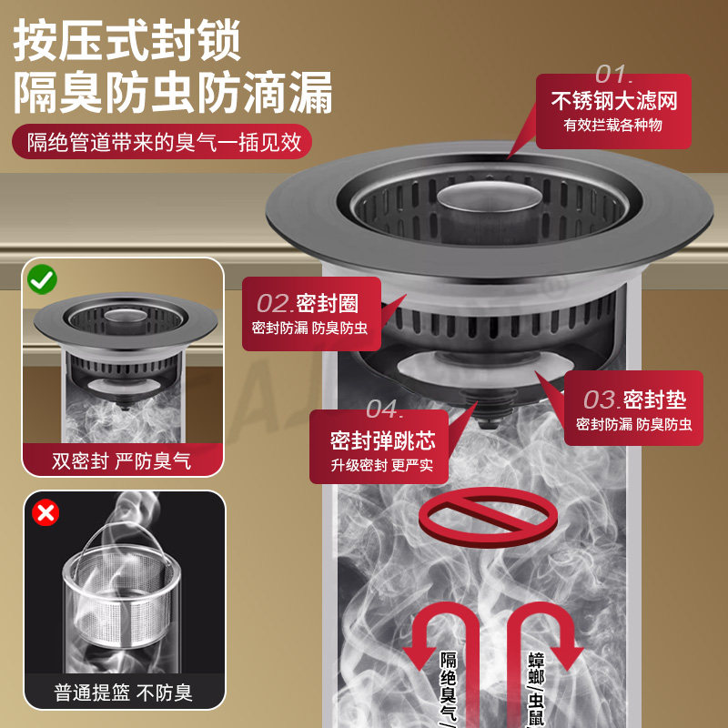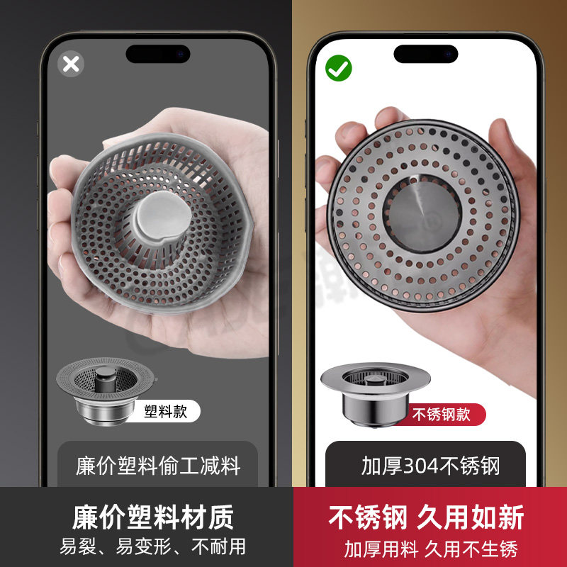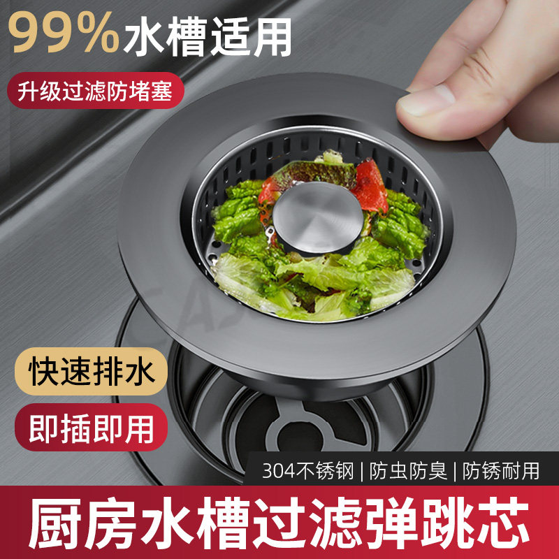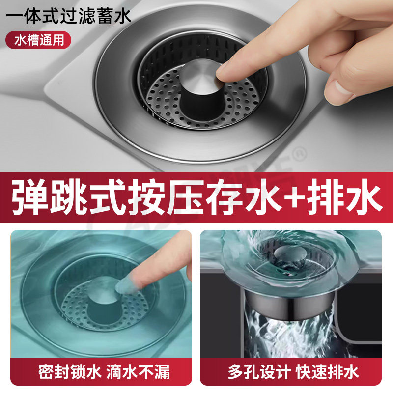 厨房水槽漏塞过滤网304不锈钢按压式弹跳芯洗碗池下水器过滤器