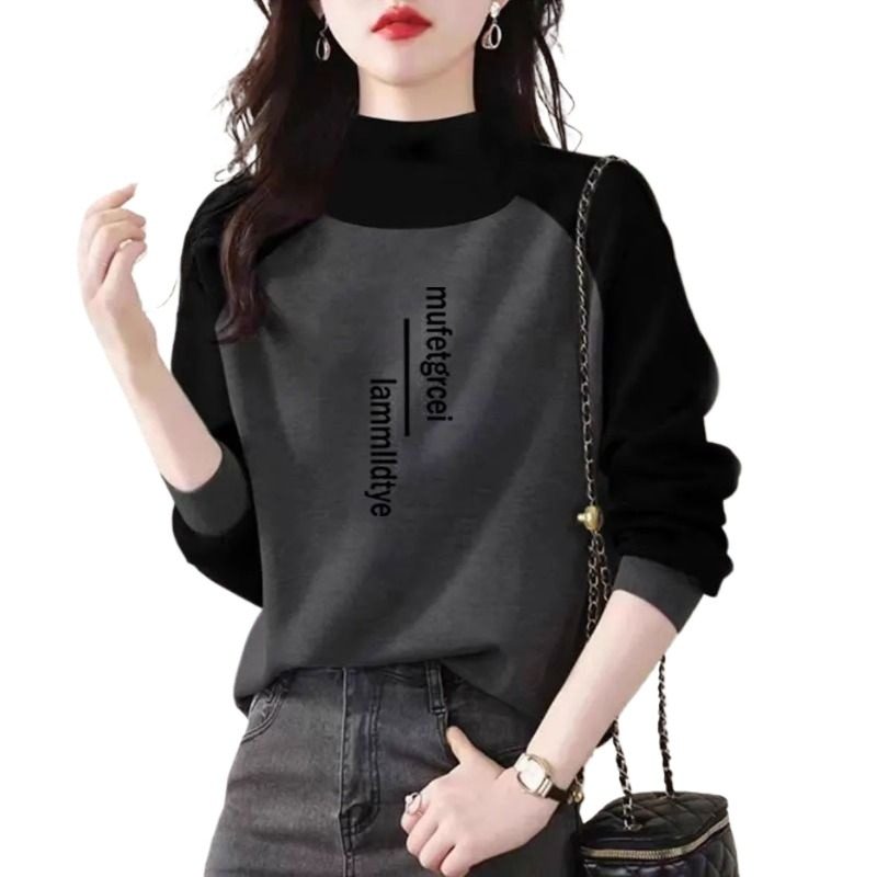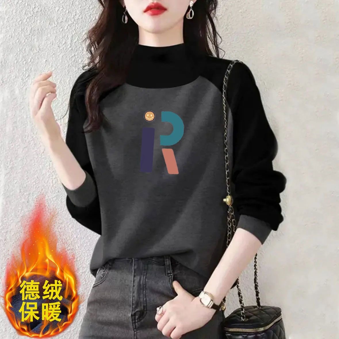 秋冬新款双面德绒拼接长袖半高领大码宽松时尚显瘦保暖减龄上衣女