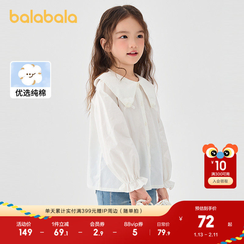 巴拉巴拉童装女童长袖衬衫儿童纯棉白衬衣2025春秋装新款上衣时尚
