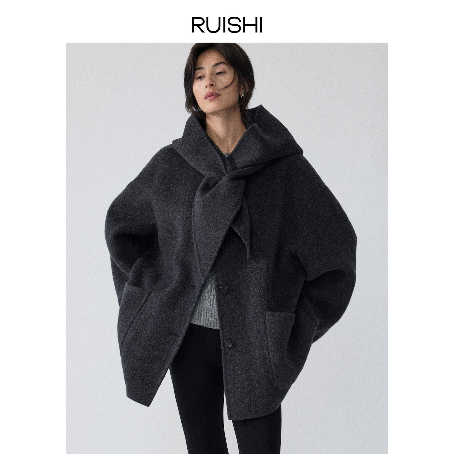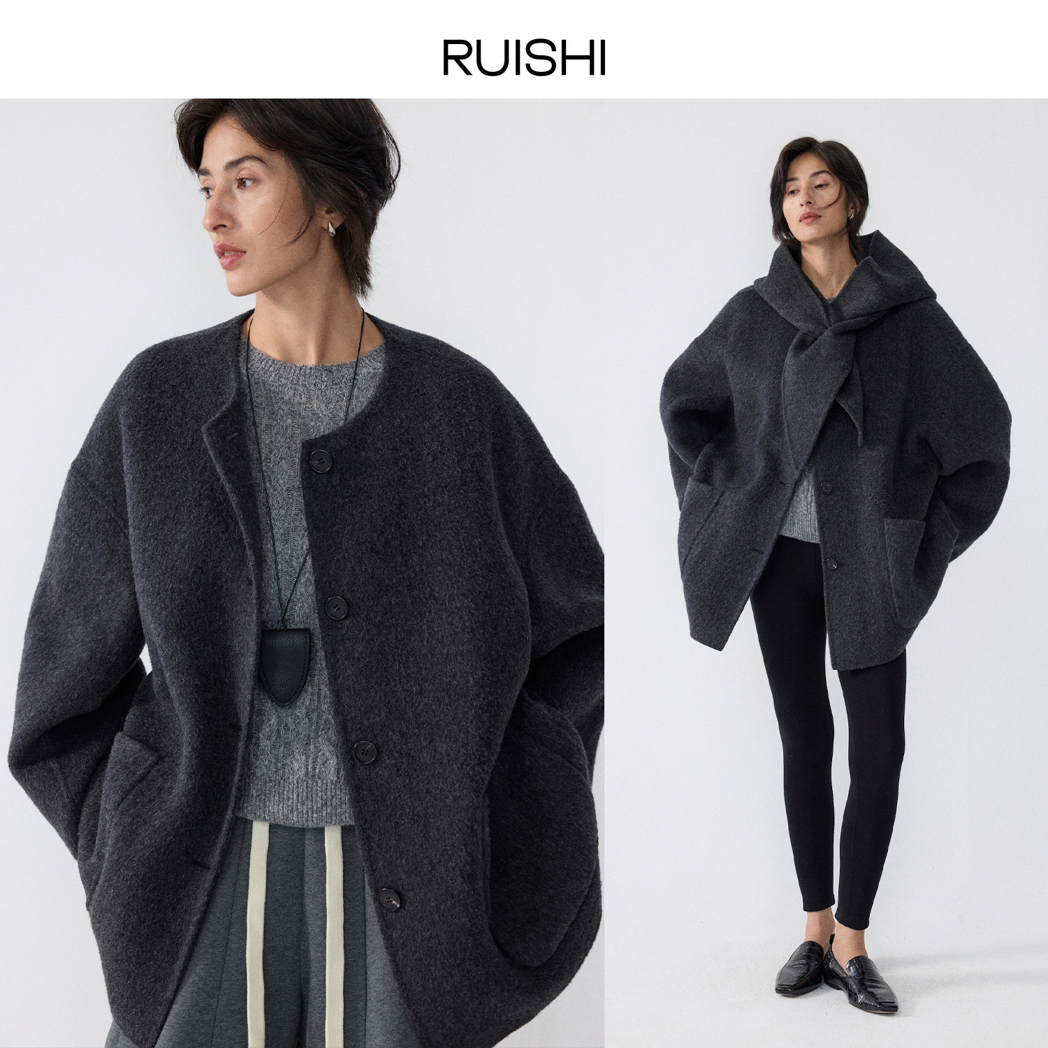 RUISHI芮时 “布尔乔亚”羊驼毛混纺兔耳围巾圆领双面呢大衣女冬
