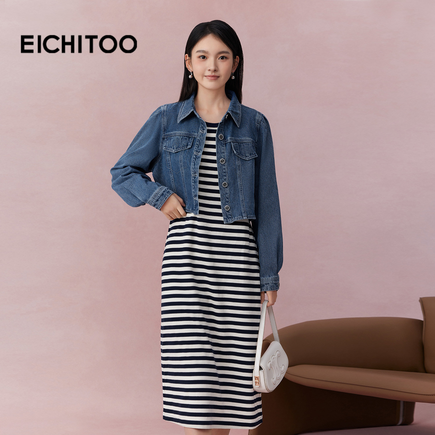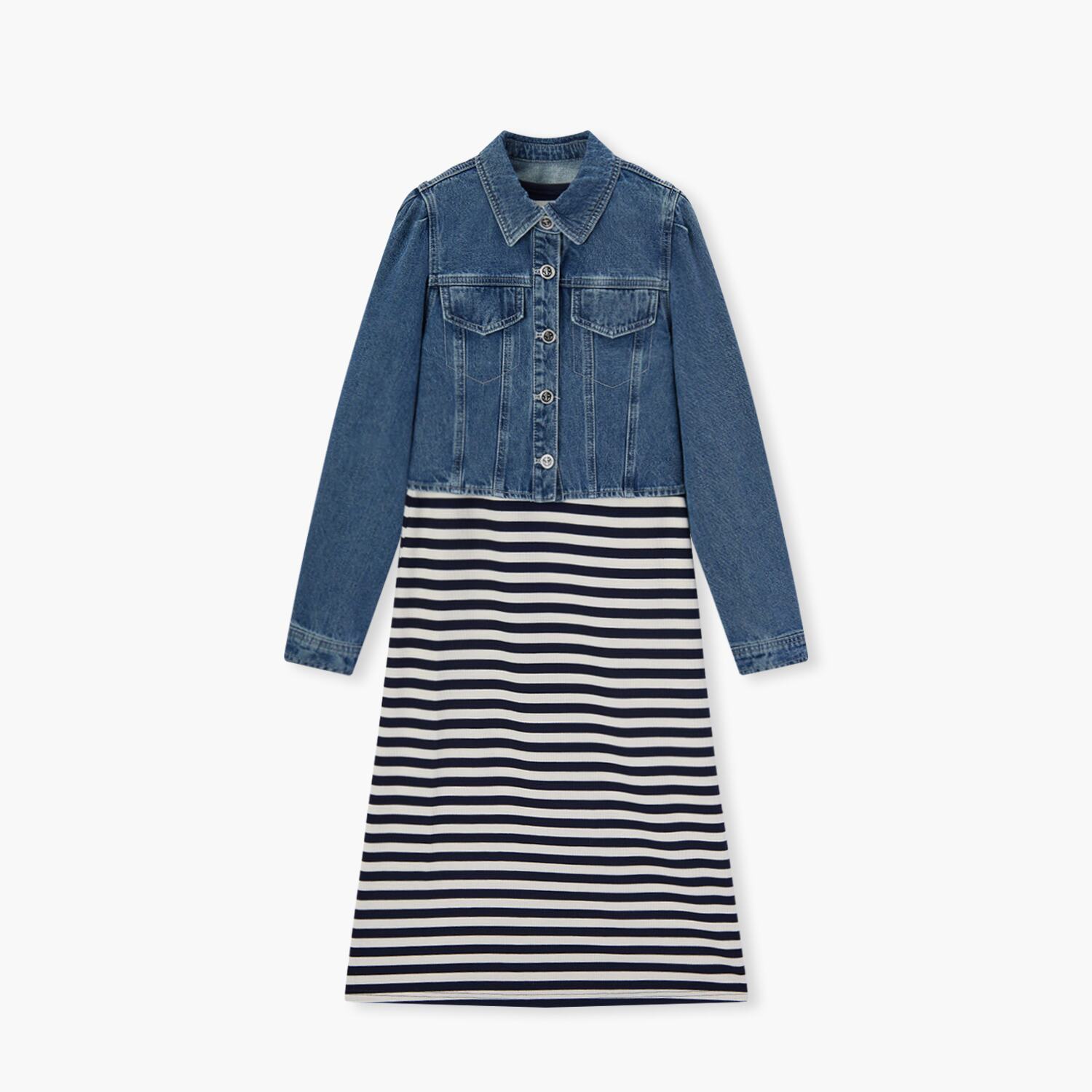 爱居兔时尚套装女2026年春季新款设计感条纹连衣裙搭牛仔短外套