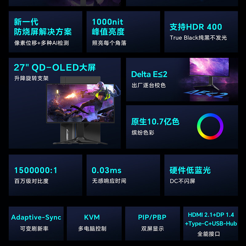 雷神QD-OLED三星面板2K26.5英寸500Hz HDR1000游戏电竞显示器