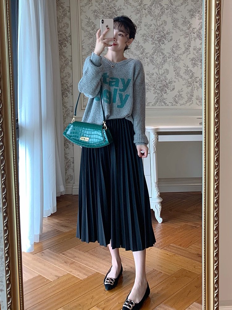 MJ STYLE灰色百褶西装裙女秋冬半身裙高腰休闲大摆a字过膝中长裙