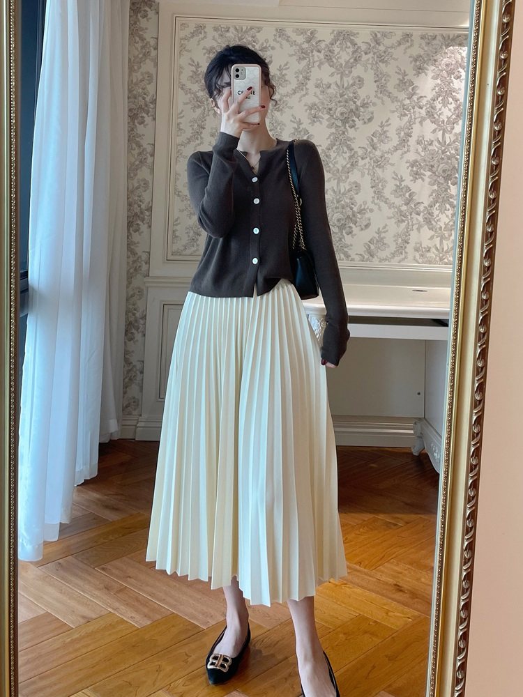 她池松紧腰百褶裙2025秋装新款女装时尚简约中长款A字高腰半身裙