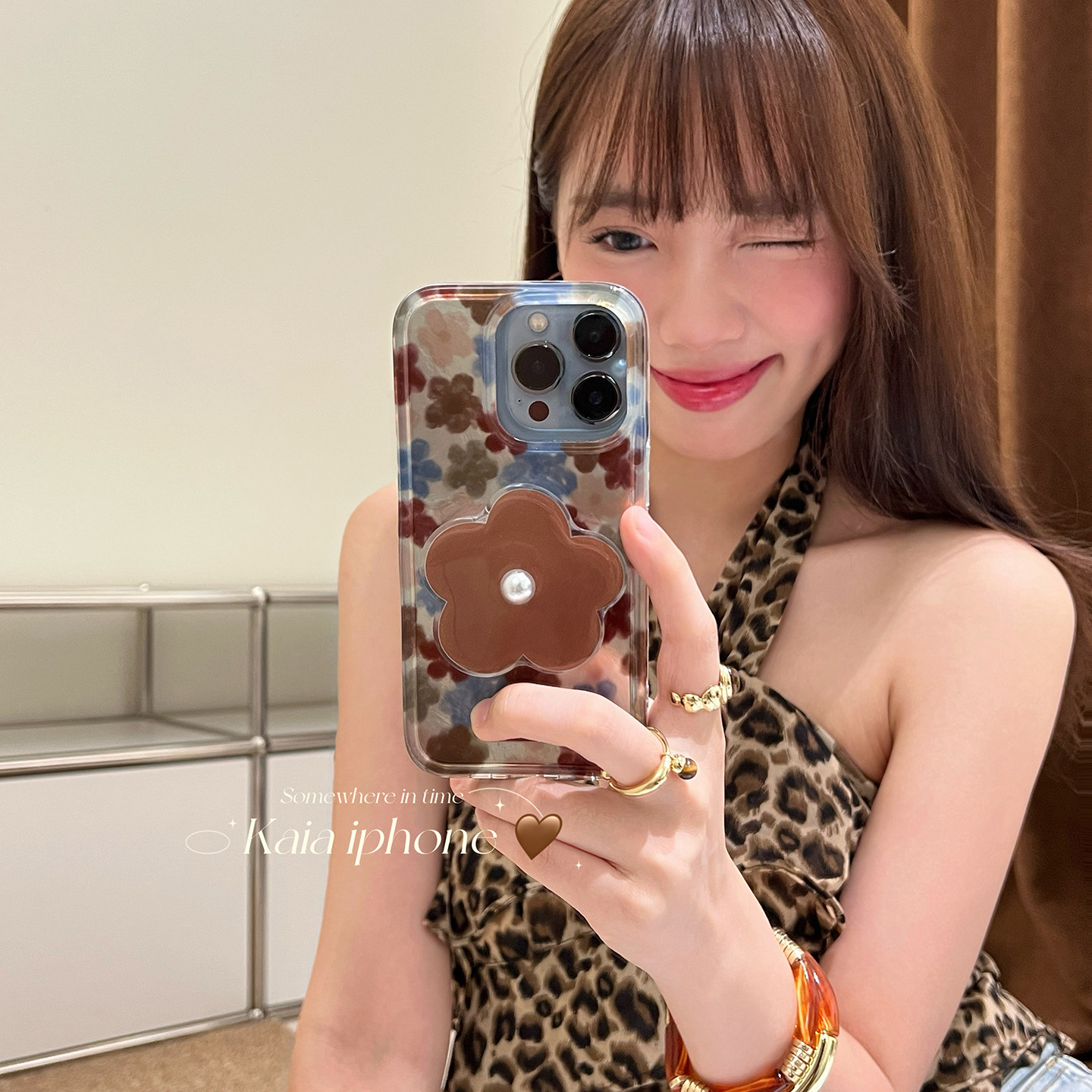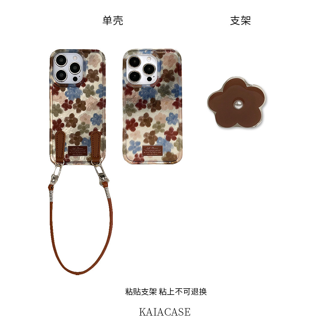 kaia小众复古高级感棕色珍珠花朵适用苹果16promax手机壳iphone13新款15女14pro腕带挂绳16pro全包镭射手机套