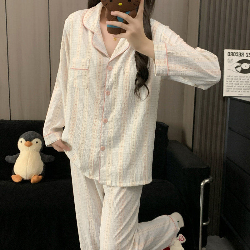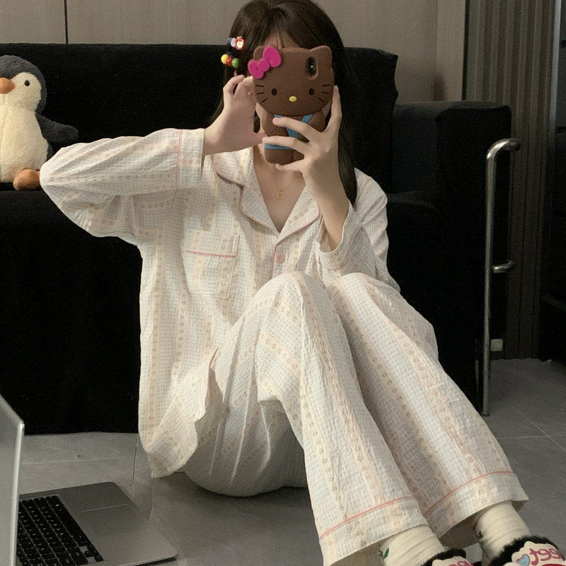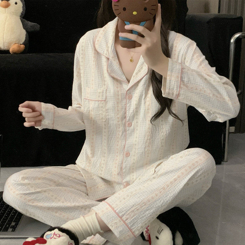 红豆甜美简约碎花条纹大尺码睡衣女春秋长袖云朵纯棉纱少女家居服