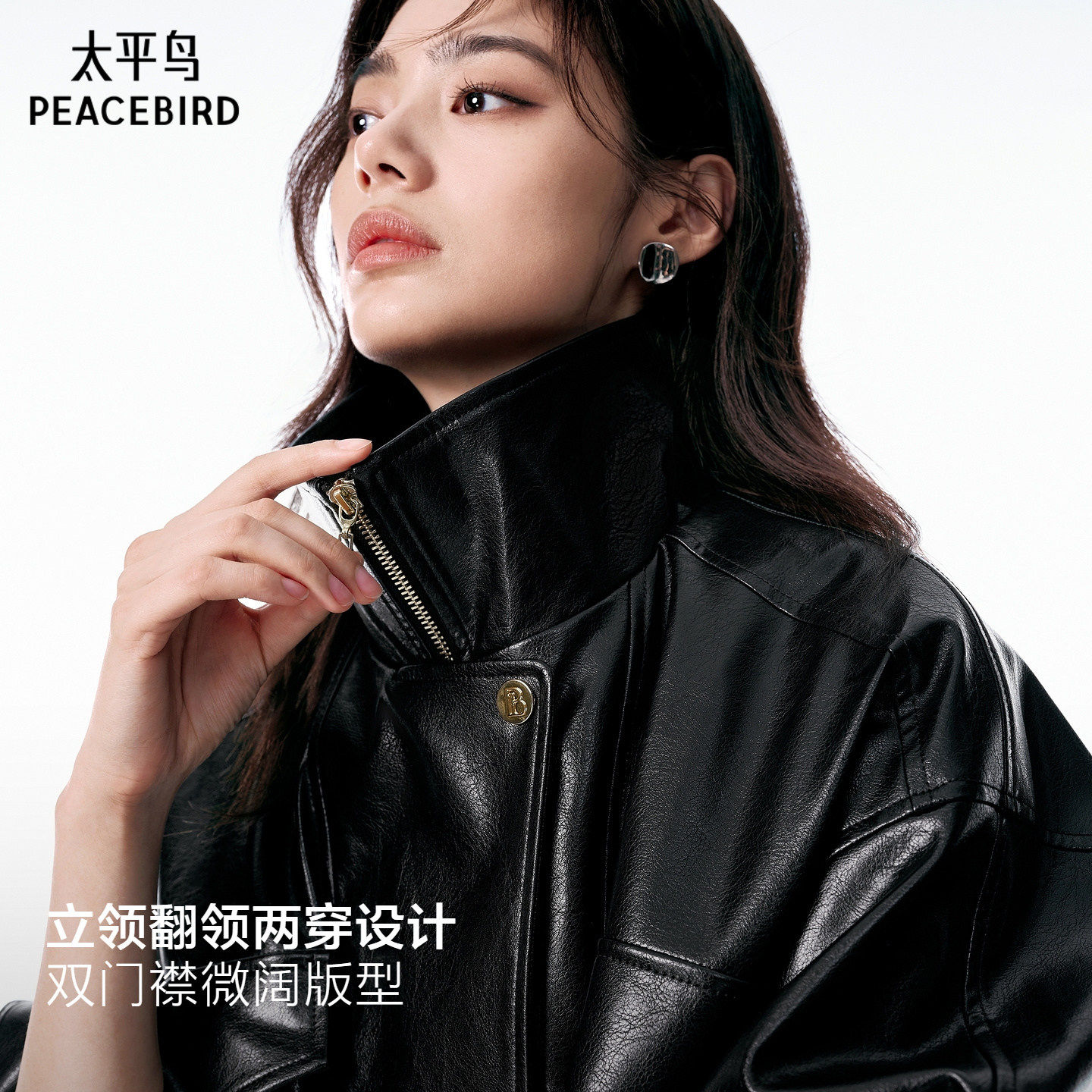 【达播专属】太平鸟肌理PU机车皮衣复古廓形外套简约立领