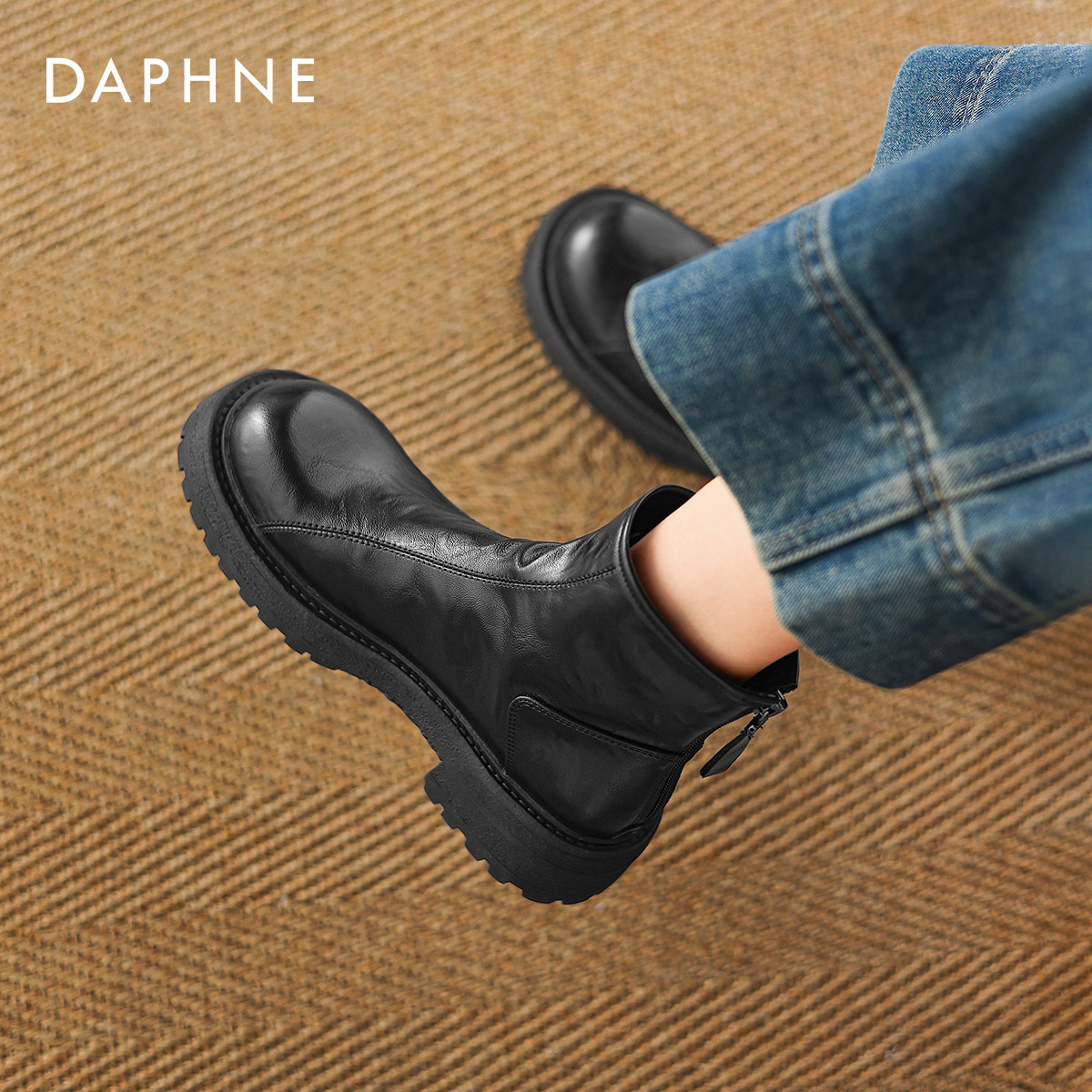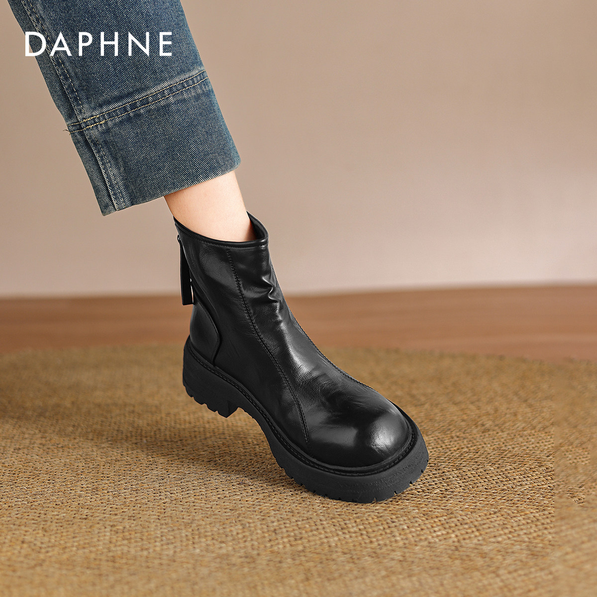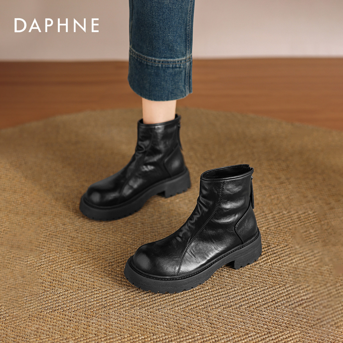 达芙妮黑色短靴女2026春季新款英伦风粗跟马丁靴圆头厚底烟筒靴子