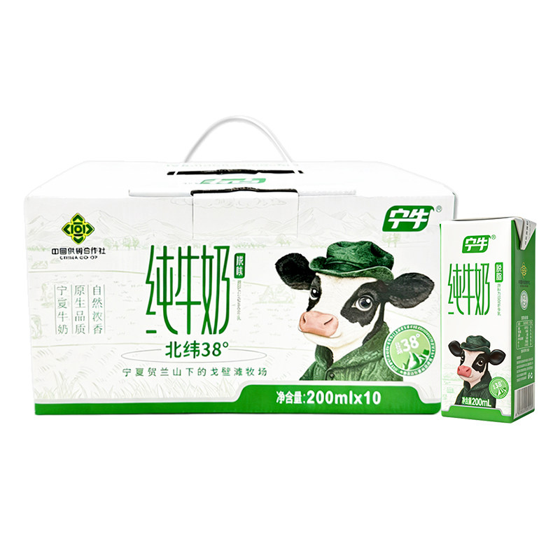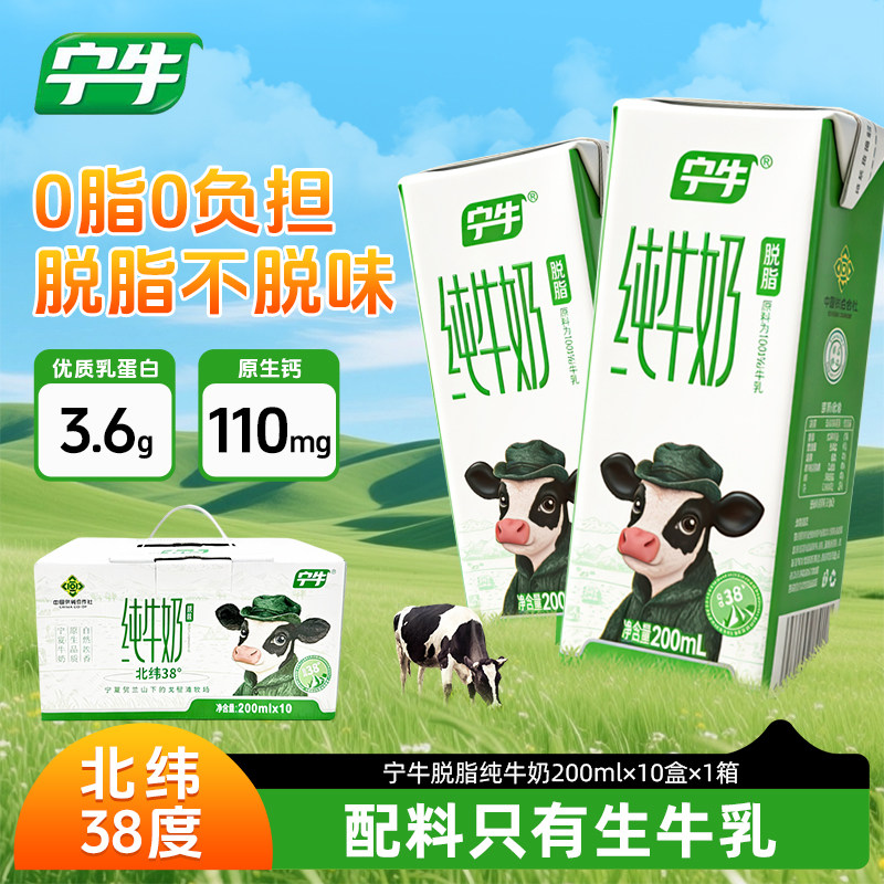 宁牛3.6蛋白质脱脂纯牛奶200ml*10盒整箱礼盒装学生成人营养早餐