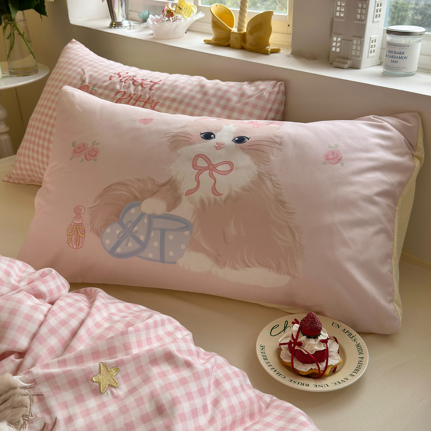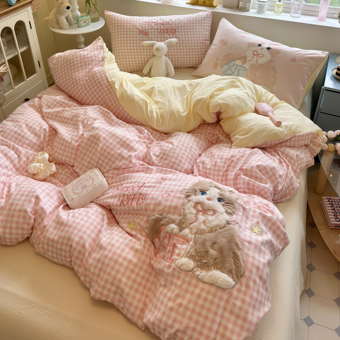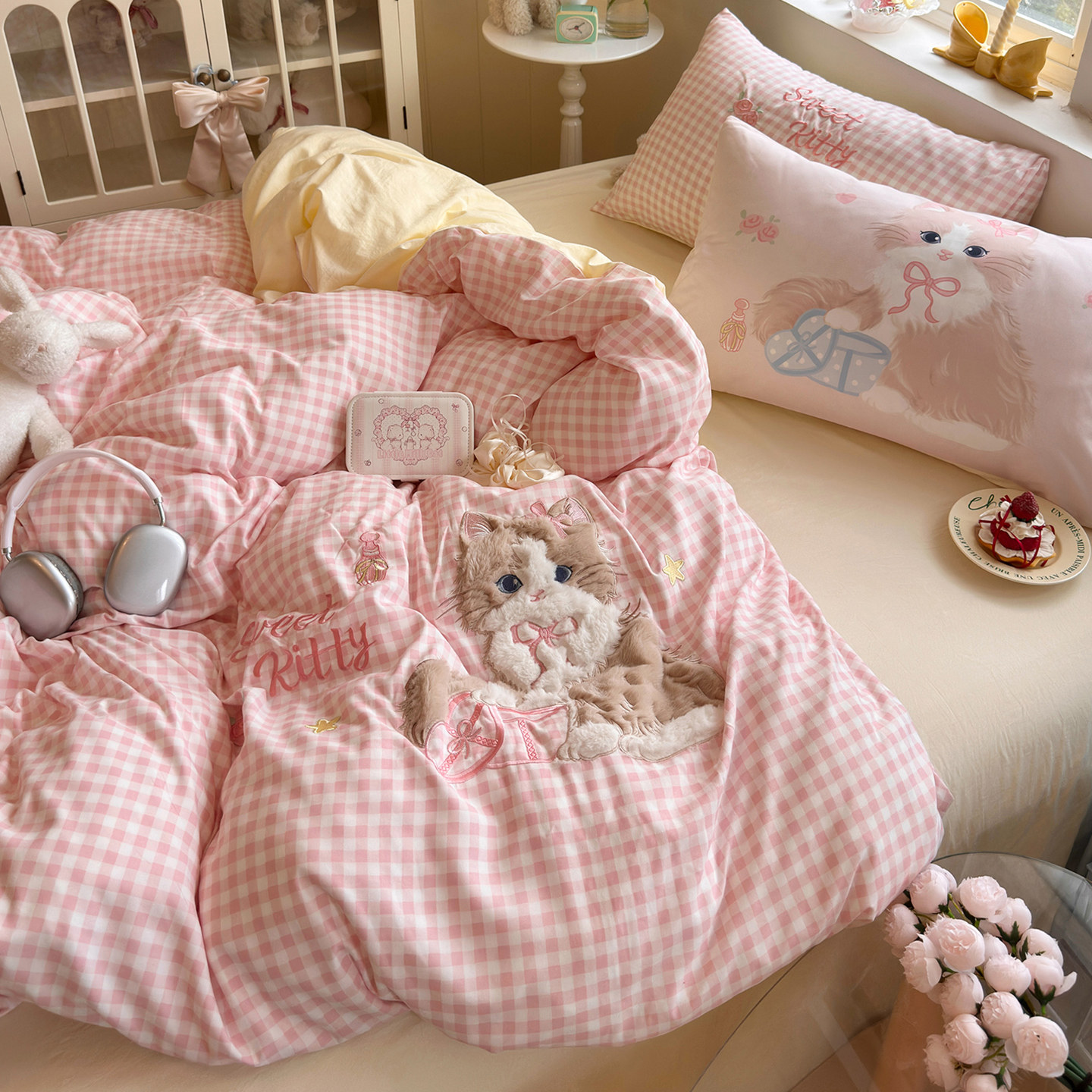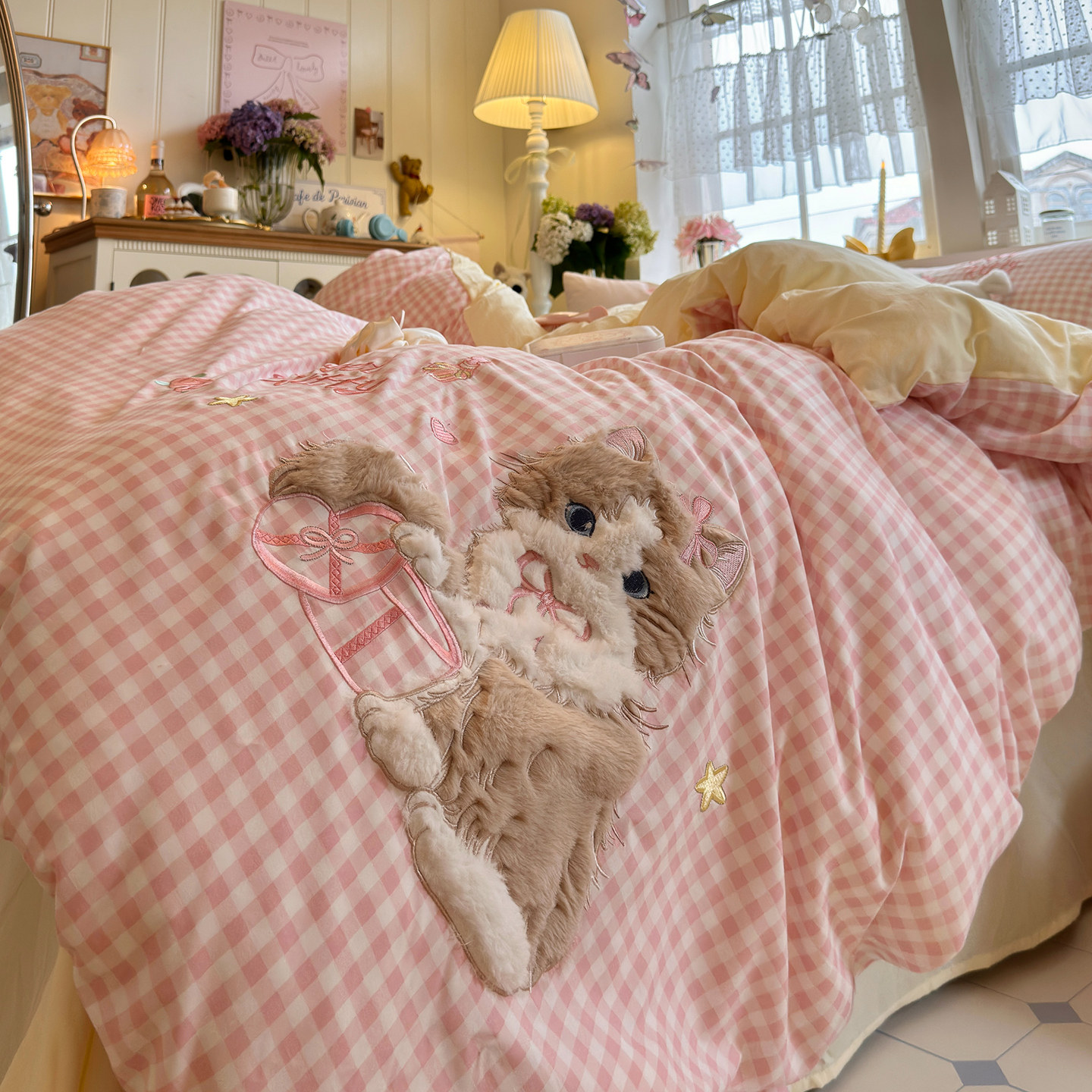 少女心贴布绣四件套水洗棉被套床单学生宿舍床上三件套非全棉纯棉