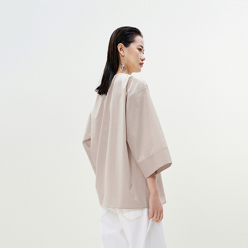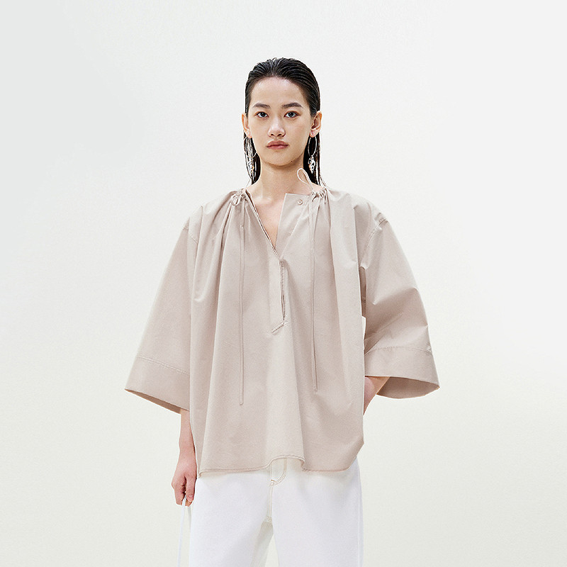 LESS春夏廓形衬衣女系带抽褶圆领松弛感宽松七分袖衬衫2P4212500