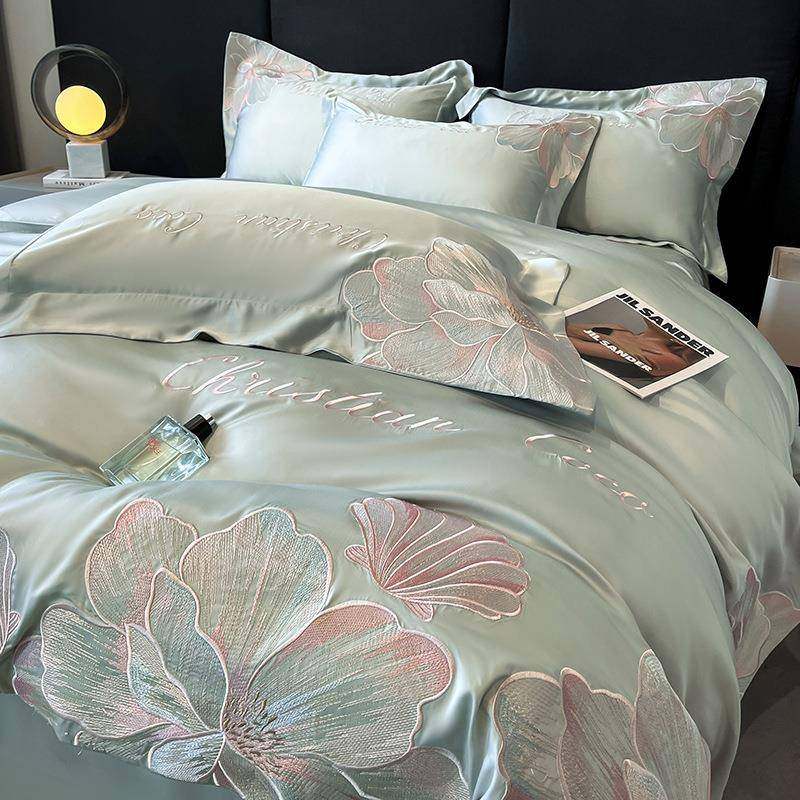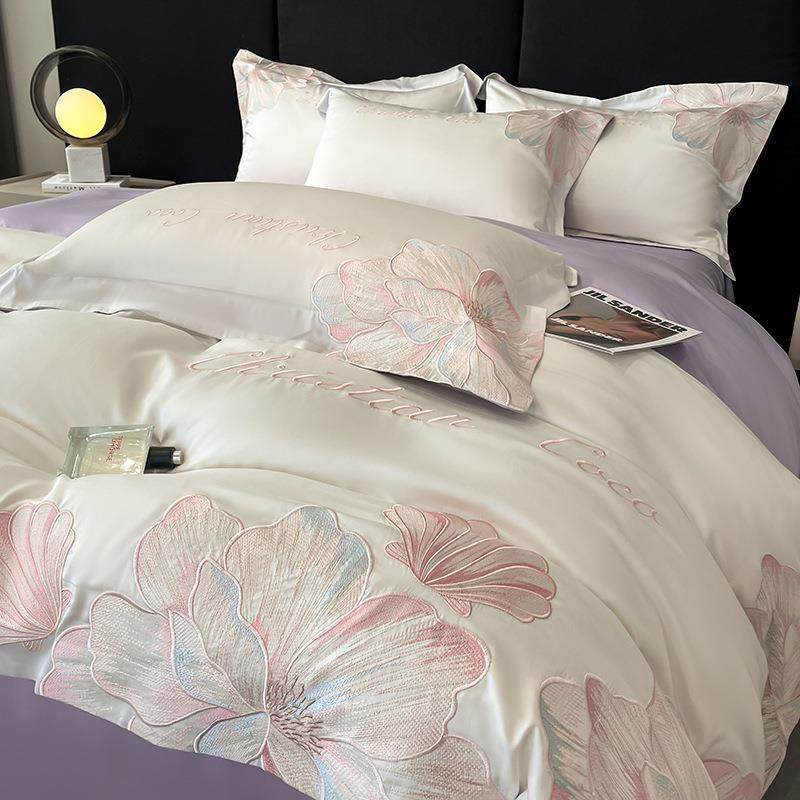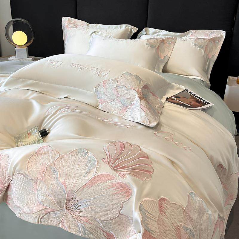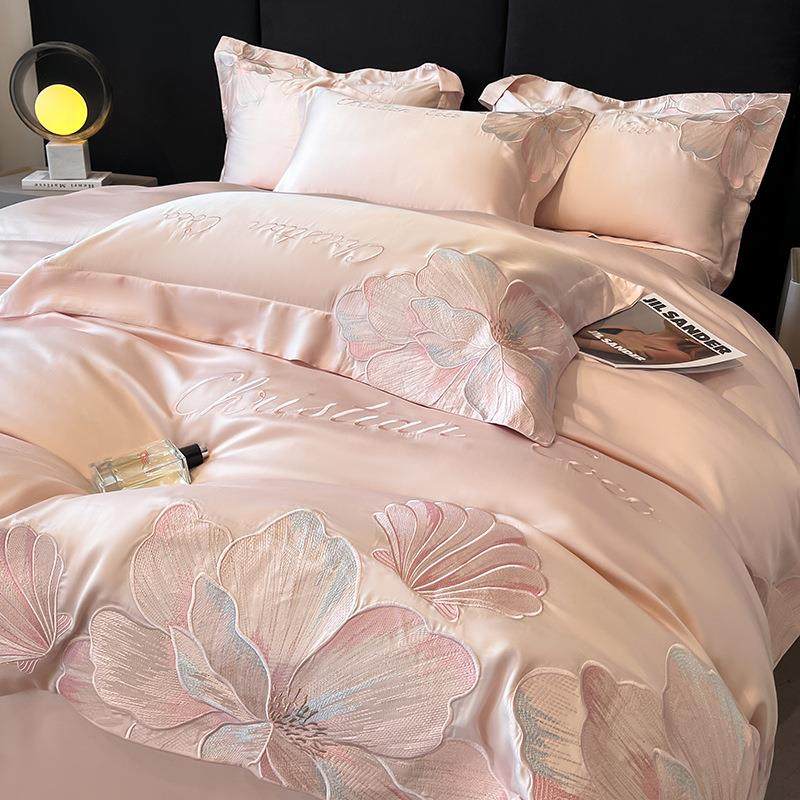轻奢感夏季凉感冰丝四件套双面真丝刺绣被套丝滑裸睡床单床品