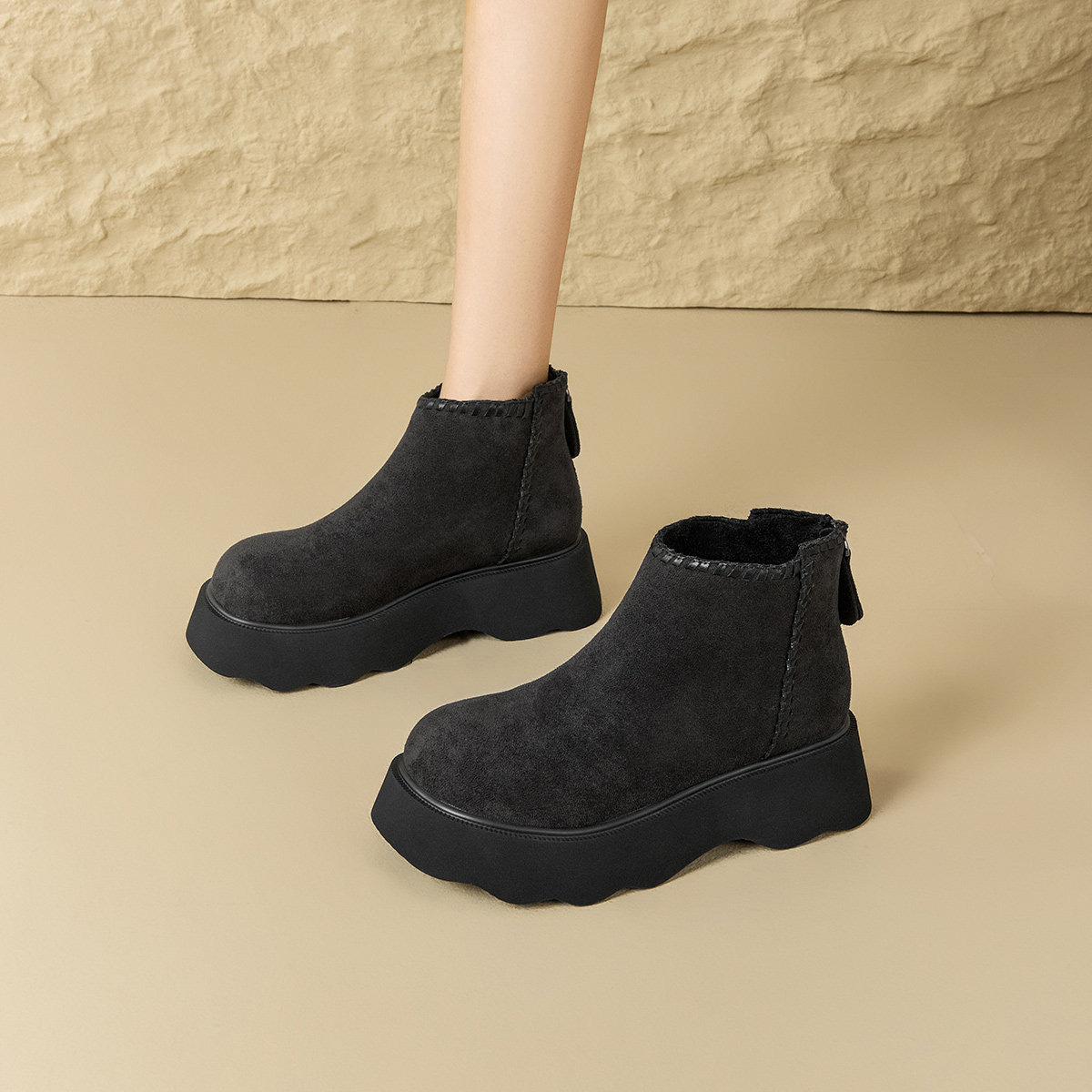 棕色靴子!小个子内增高7CM法式方头靴2025冬新款绒面粗跟短靴女