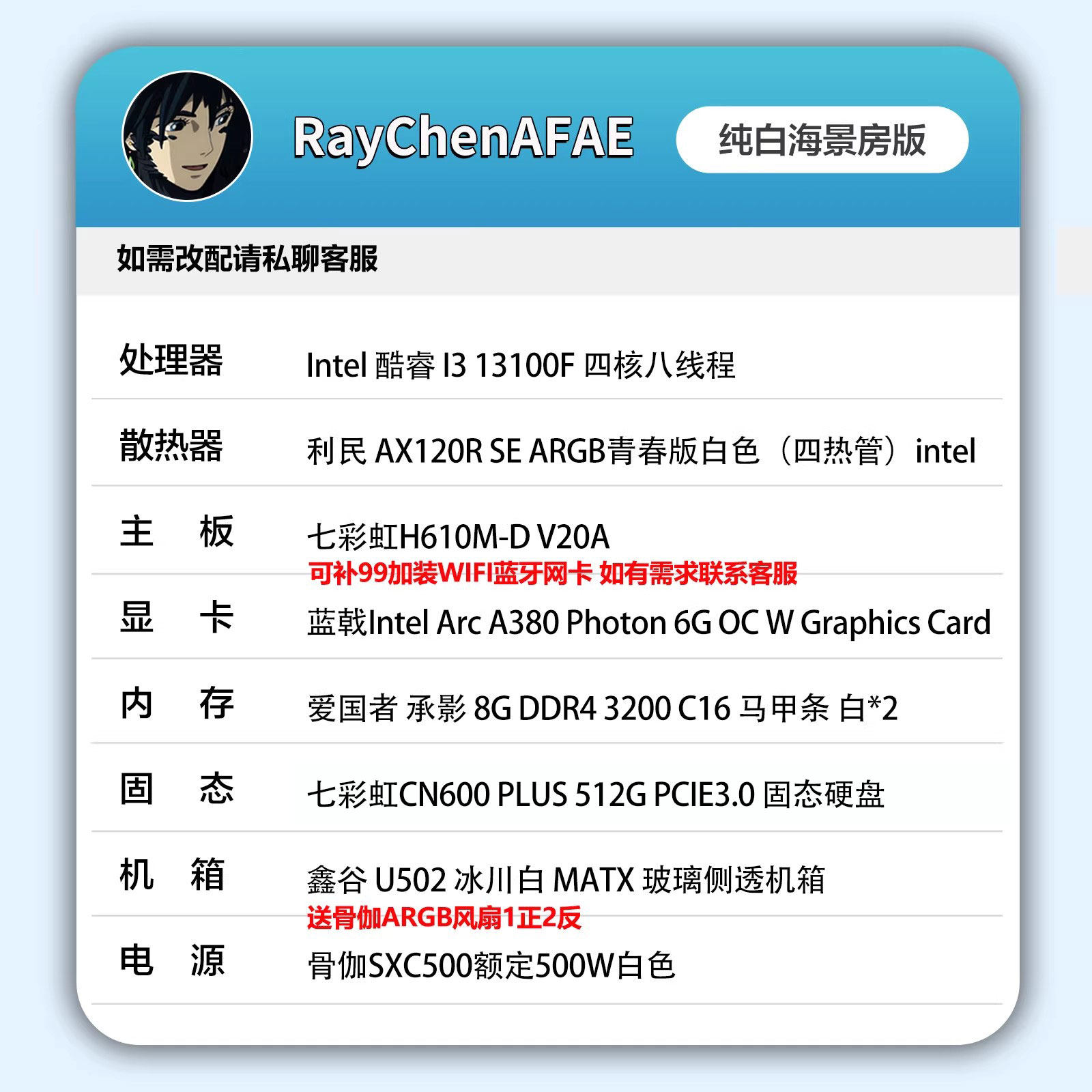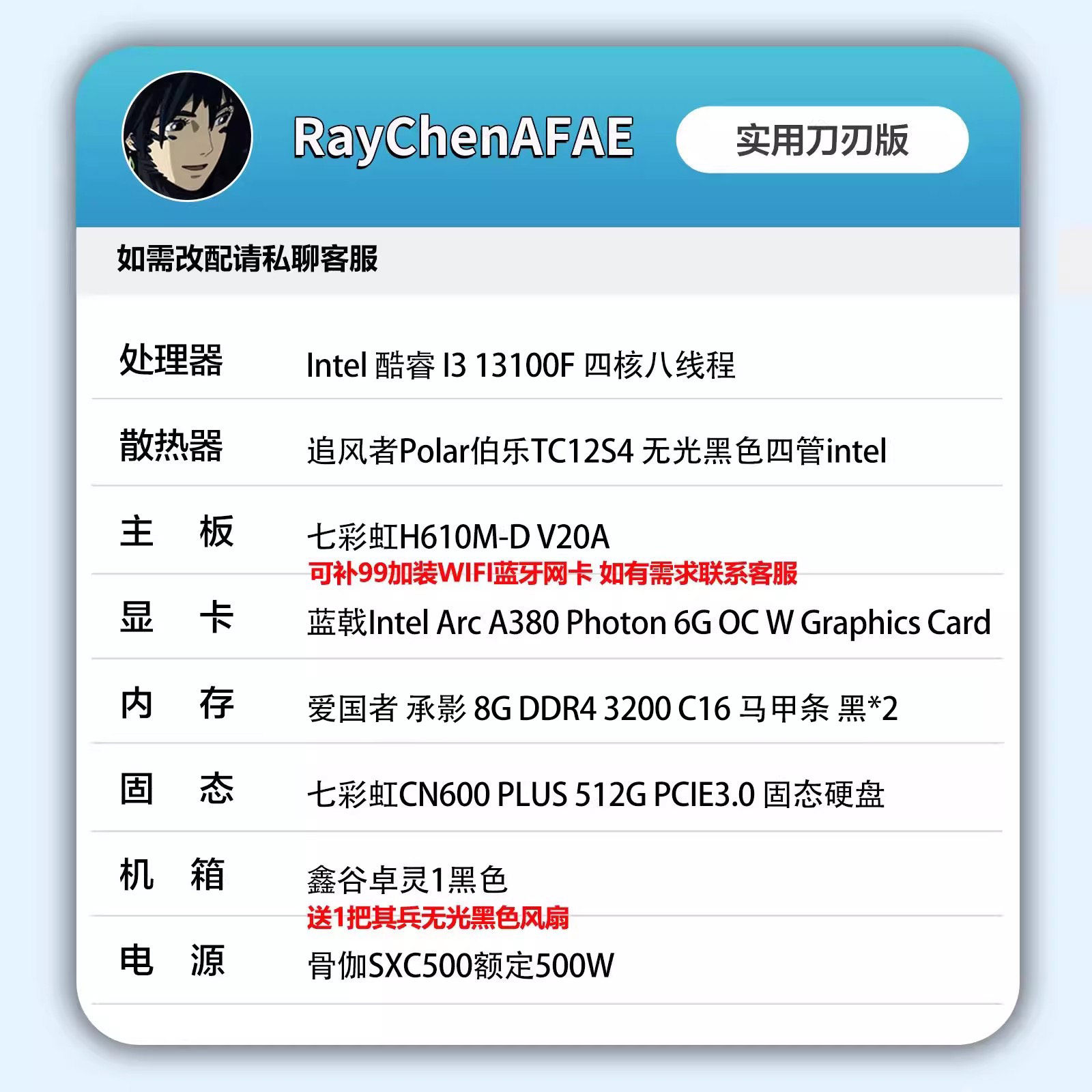 2000元视频神机推荐款13100F+A380 高性价比 DIY游戏电脑主机