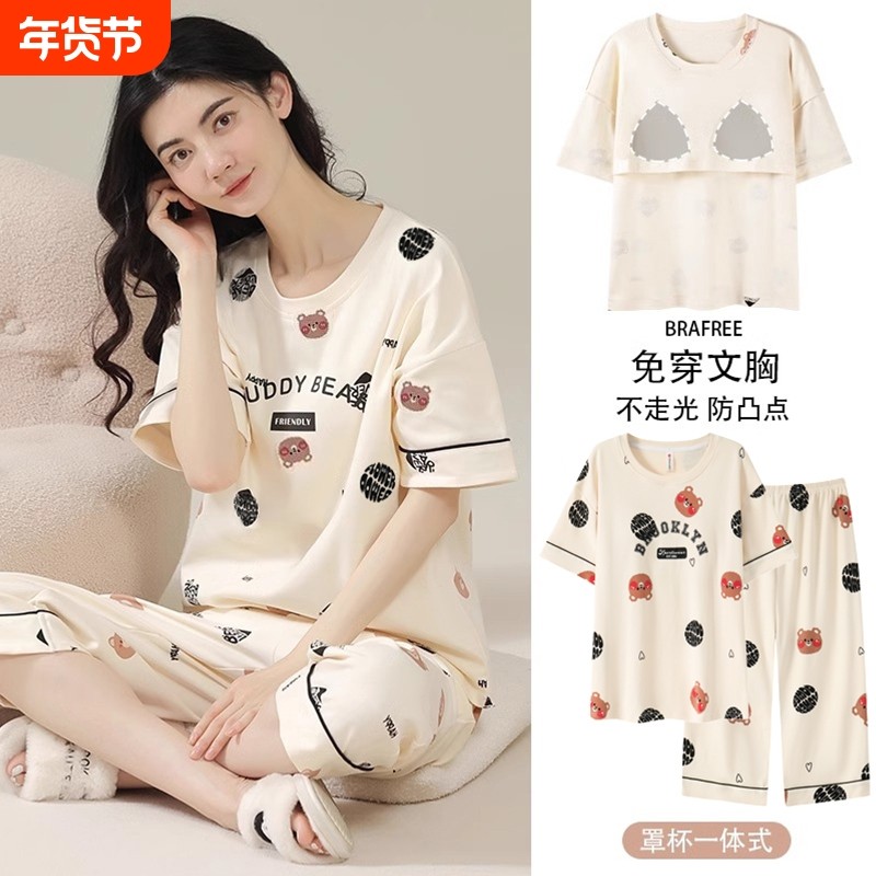 带胸垫睡衣女款2025纯棉夏季新款短袖七分裤女士可外穿家居服套装
