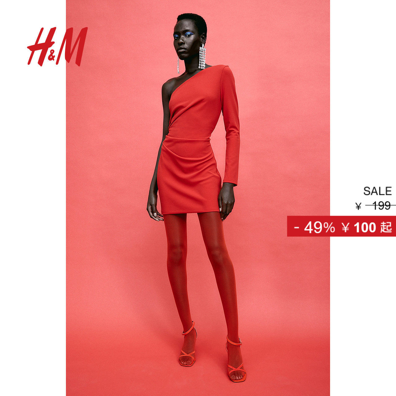 HM女装红色连衣裙冬季新年战袍斜领气质单肩修身礼服裙1206463