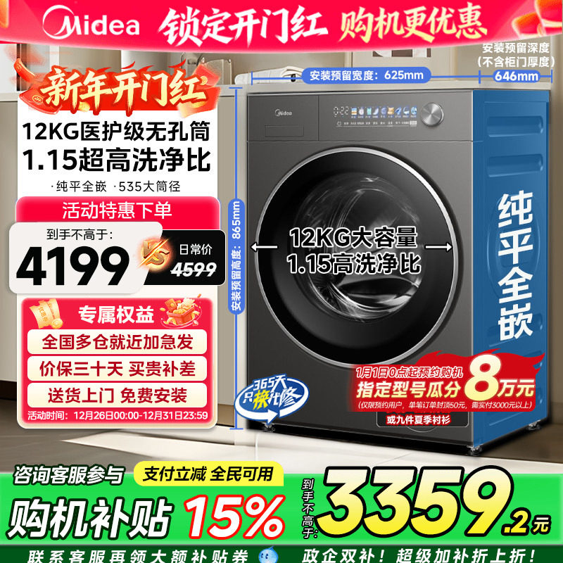 【全民补贴】美的元气2.0洗衣机家用全自动10/12kg滚筒洗烘脱一体