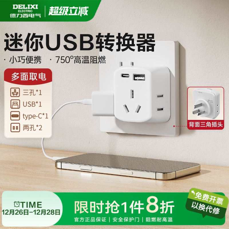 德力西插座转换器usb插头多口扩展器宿舍迷你小巧一转多插排旗舰