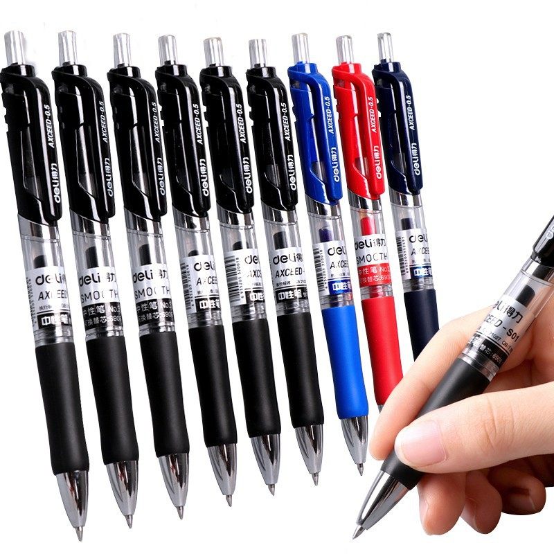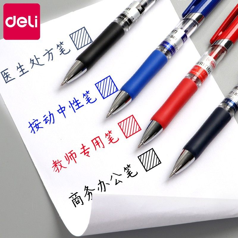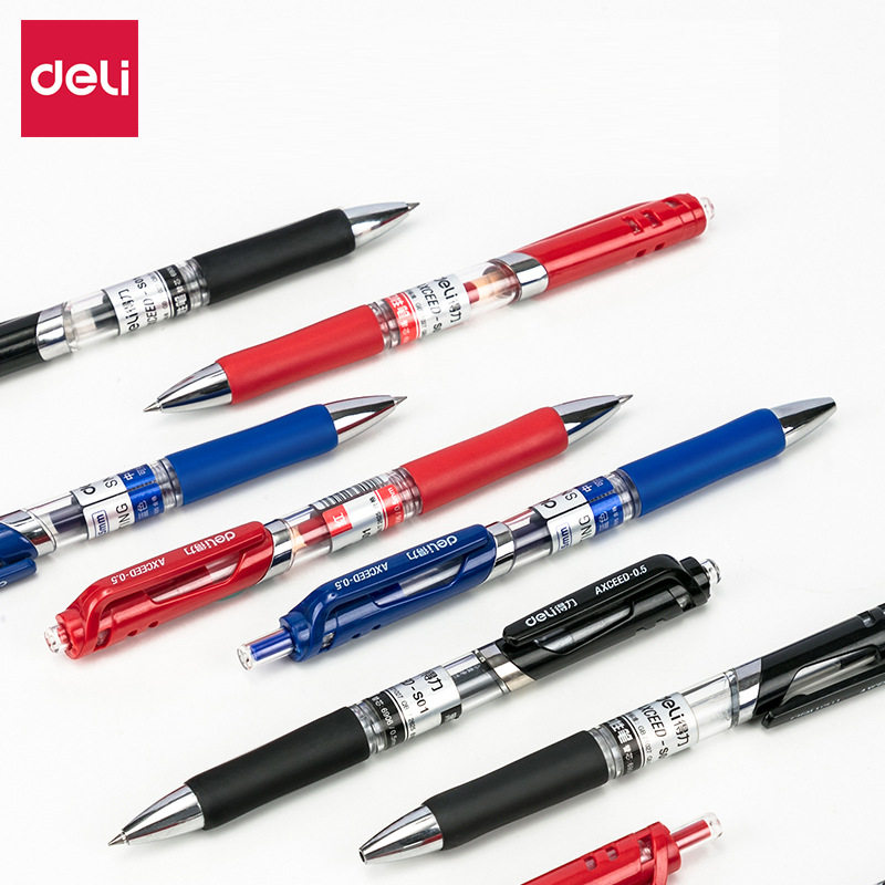 得力按动式中性笔子弹头红笔0.5mm自动黑笔蓝学生用考试办公批发