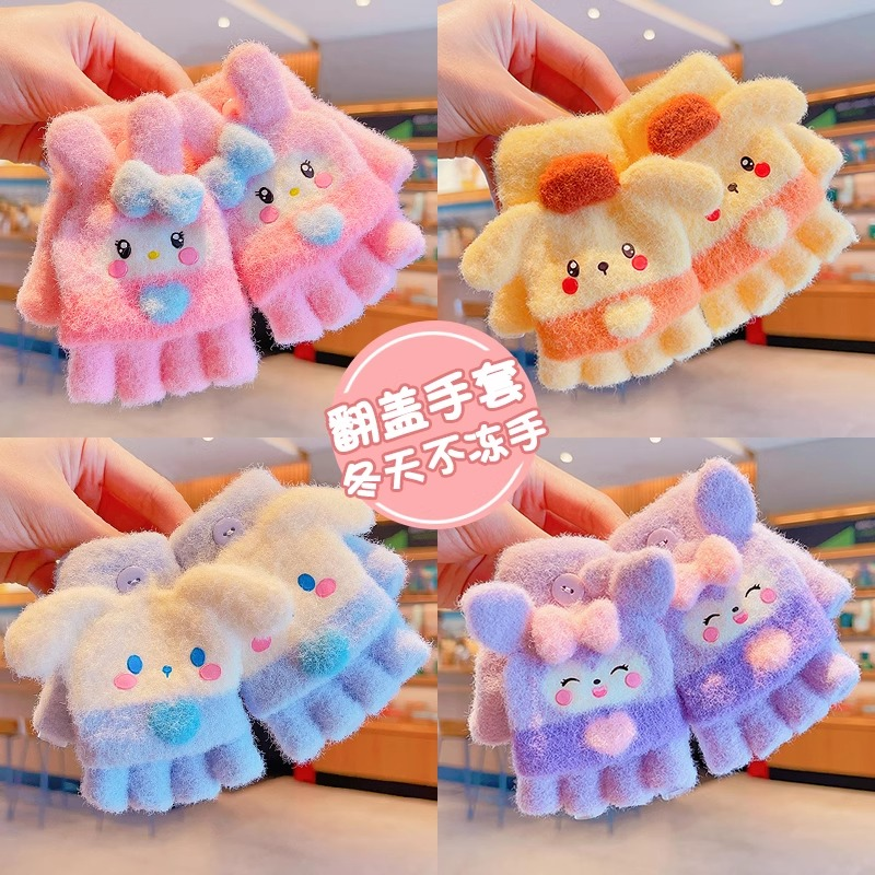 儿童手套女童秋冬季保暖库洛米半指翻盖宝宝五指露指美乐蒂针织