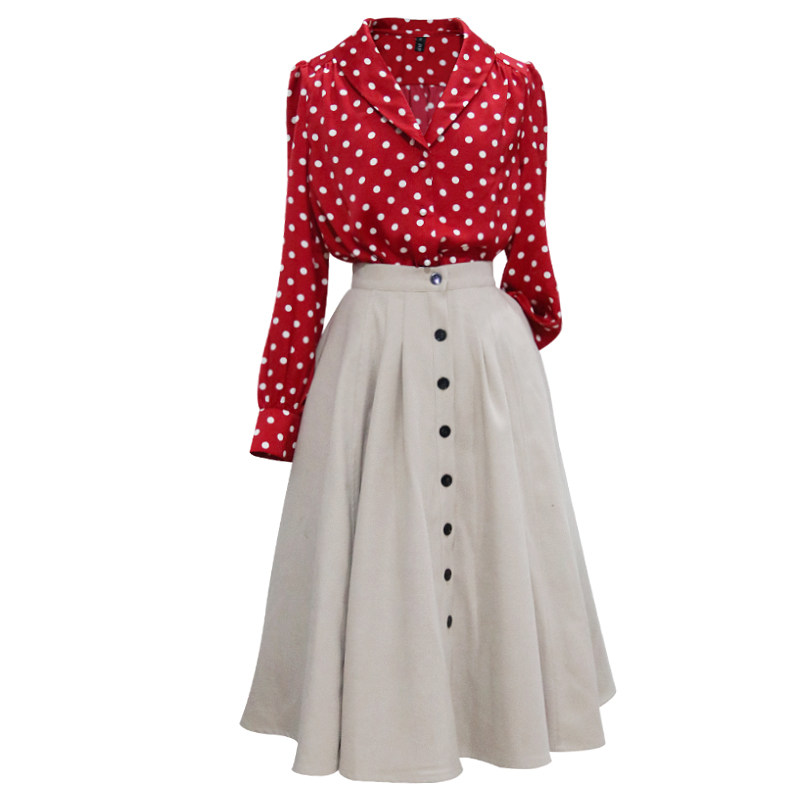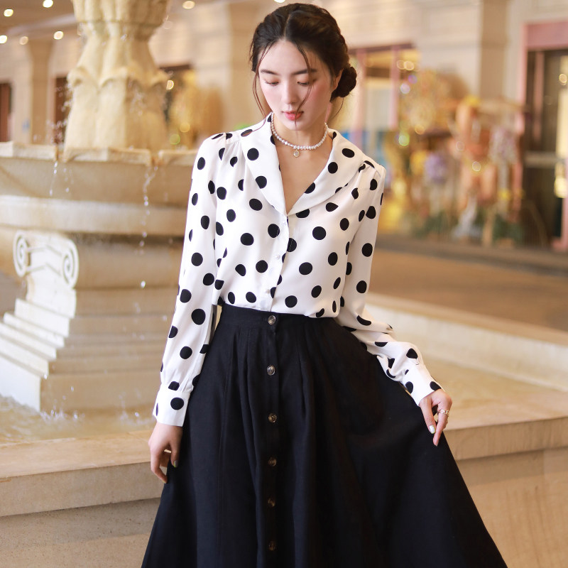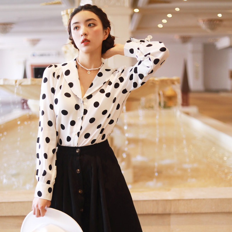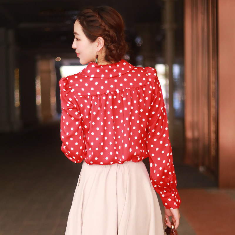 春秋季红色长袖衬衫法式复古港风宽松上衣白波点雪纺衫气质女休闲